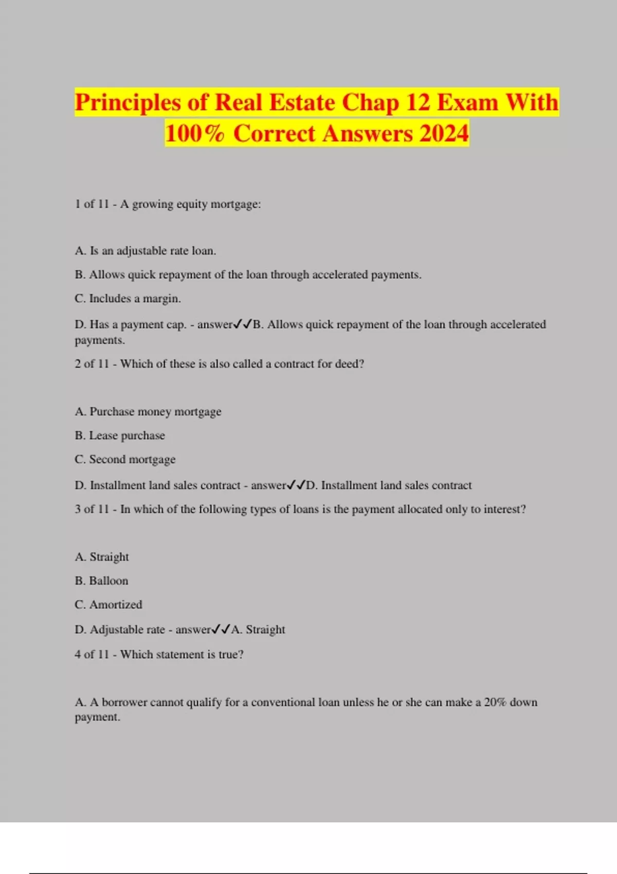 Principles of Real Estate Chap 12 Exam With 100% Correct Answers 2024 1 of 11 - A growing equity mortgage: A. Is an adjustable rate loan. B. Allows quick repayment of the loan through accelerated payments. C. Includes a margin. D. Has a payment cap. - answerB. Allows quick repayment of the loan through accelerated payments. 2 of 11 - Which of these is also called a contract for deed? A. Purchase money mortgage B. Lease purchase C. Second mortgage D. Installment land sales contract - answerD. Installment land sales contract 3 of 11 - In which of the following types of loans is the payment allocated only to interest? A. Straight B. Balloon C. Amortized D. Adjustable rate - answerA. Straight 4 of 11 - Which statement is true? A. A borrower cannot qualify for a conventional loan unless he or she can make a 20% down payment. B. Private mortgage insurance is available for FHA loans. C. A borrower can request the cancellation of PMI payments when the equity reaches 20% of the appraised value. D. A lender can continue to collect PMI payments until the homeowner's equity reaches 25%. - answerC. A borrower can