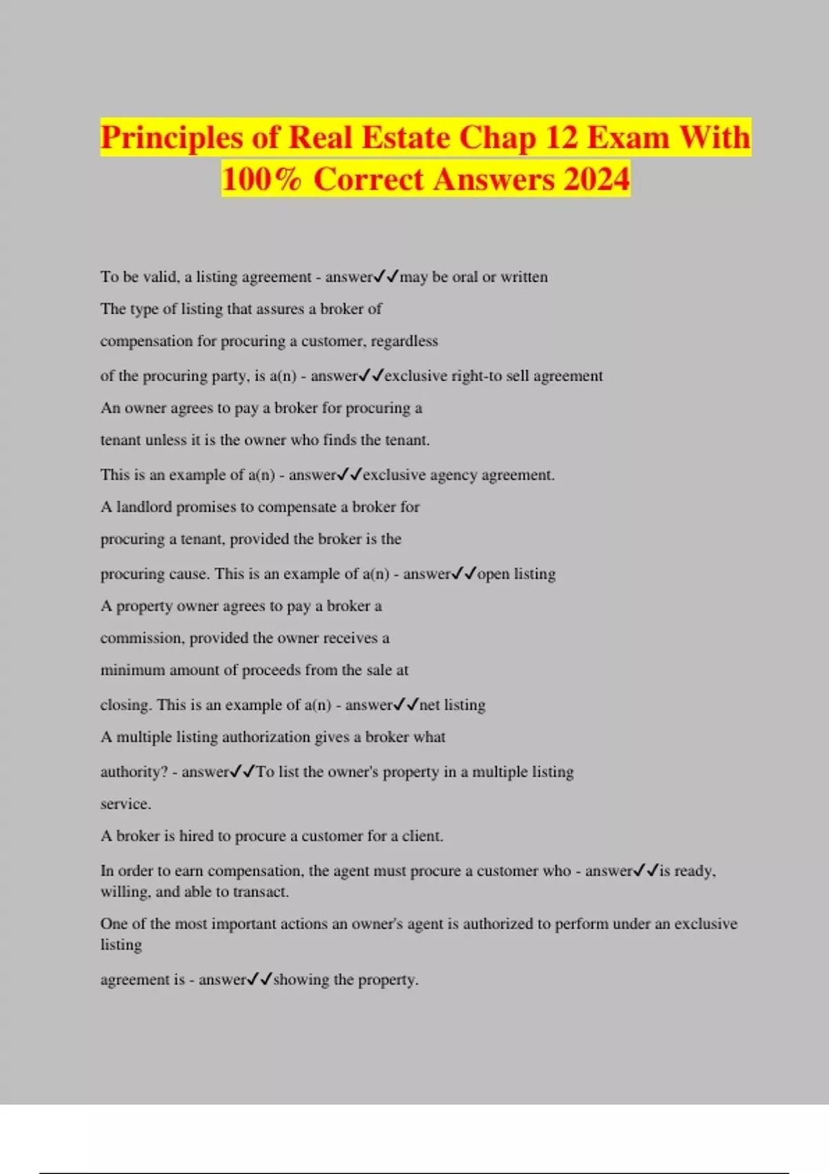 Principles of Real Estate Chap 12 Exam With 100% Correct Answers 2024 To be valid, a listing agreement - answermay be oral or written The type of listing that assures a broker of compensation for procuring a customer, regardless of the procuring party, is a(n) - answerexclusive right-to sell agreement An owner agrees to pay a broker for procuring a tenant unless it is the owner who finds the tenant. This is an example of a(n) - answerexclusive agency agreement. A landlord promises to compensate a broker for procuring a tenant, provided the broker is the procuring cause. This is an example of a(n) - answeropen listing A property owner agrees to pay a broker a commission, provided the owner receives a minimum amount of proceeds from the sale at closing. This is an example of a(n) - answernet listing A multiple listing authorization gives a broker what authority? - answerTo list the owner's property in a multiple listing service. A broker is hired to procure a customer for a client. In order to earn compensation, the agent must procure a customer who - answeris ready, willing, and able to transact. One of the most important actions an owner's agent is authorized to perform under an exclusive listing agreement is - answershowing the property