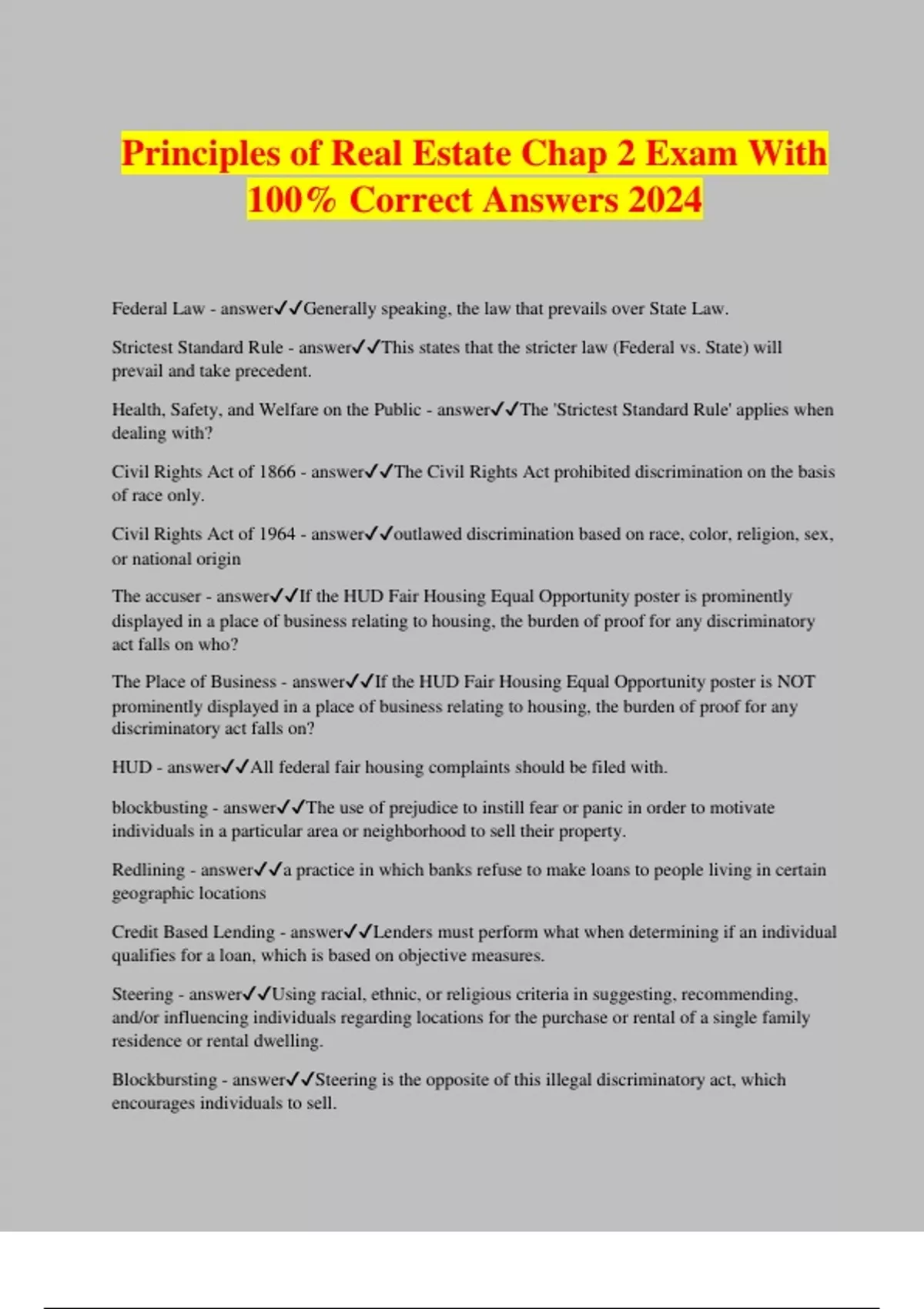Principles of Real Estate Chap 2 Exam With 100% Correct Answers 2024 Federal Law - answerGenerally speaking, the law that prevails over State Law. Strictest Standard Rule - answerThis states that the stricter law (Federal vs. State) will prevail and take precedent. Health, Safety, and Welfare on the Public - answerThe 'Strictest Standard Rule' applies when dealing with? Civil Rights Act of 1866 - answerThe Civil Rights Act prohibited discrimination on the basis of race only. Civil Rights Act of 1964 - answeroutlawed discrimination based on race, color, religion, sex, or national origin The accuser - answerIf the HU