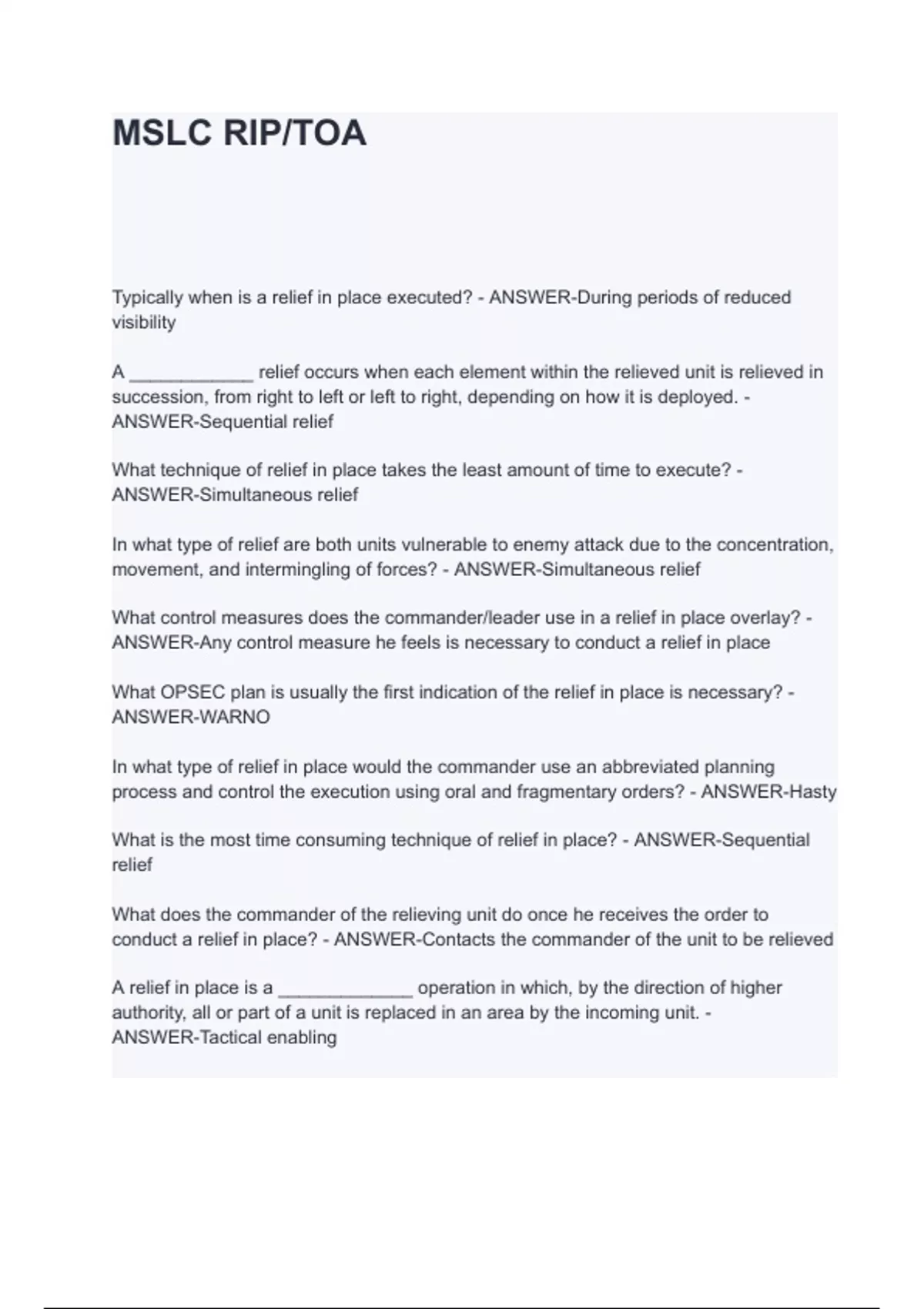 MSLC RIP/TOA QUESTIONS WITH CORRECT ANSWERS PASS 100%