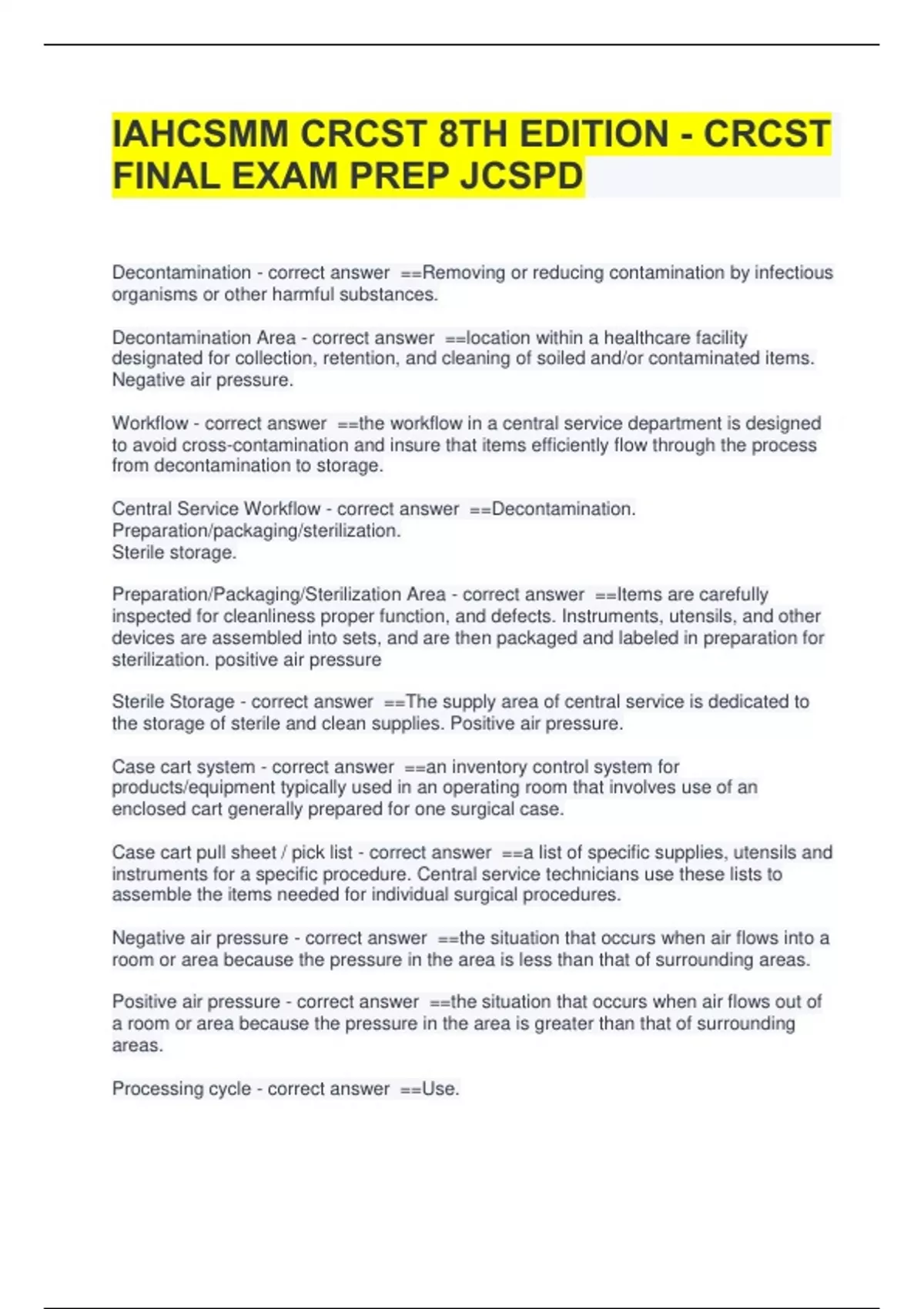 IAHCSMM CRCST 8TH EDITION - CRCST FINAL EXAM PREP JCSPD IAHCSMM CRCST 8TH EDITION - CRCST FINAL EXAM PREP JCSPD Decontamination - correct answer ==Removing or reducing contamination by infectious organisms or other harmful substances. Decontamination Area - correct answer ==location within a healthcare facility designated for collection, retention, and cleaning of soiled and/or contaminated items. Negative air pressure. Workflow - correct answer ==the workflow in a central service department is designed to avoid cross-contamination and insure that items efficiently flow through the process from decontamination to storage. Central Service Workflow - correct answer ==Decontamination. Preparation/packaging/sterilization. Sterile storage. Preparation/Packaging/Sterilization Area - correct answer ==Items are carefully inspected for cleanliness proper function, and defects. Instruments, utensils, and other devices are assembled into sets, and are then packaged and labeled in preparation for sterilization. positive air pressure Sterile Storage - correct answer ==The supply area of central service is dedicated to the storage of sterile and clean supplies. Positive air pressure. Case cart system - correct answer ==an inventory control system for products/equipment typically used in an operating room that involves use of an enclosed cart generally prepared for one surgical case. Case cart pull sheet / pick list - correct answer ==a list of specific supplies, utensils and instruments for a specific procedure. Central service technicians use these lists to assemble the items needed for individual surgical procedures. Negative air pressure - correct answer ==the situation that occurs when air flows into a room or area because the pressure in the area is less than that of surrounding areas. Positive air pressure - correct answer ==the situation that occurs when air flows out of a room or area because the pressure in the area is greater than that of surrounding areas. Processing cycle - correct answer ==Use. Return. Identify. clean. assemble. package. sterilize. store. Deliver. At each step in the process, items are inspected to ensure that they are clean, in good repair, assembled and processed correctly. Standard precautions - correct answer ==methods of using appropriate barriers to prevent transmissions of infectious organisms from contact with blood and all other body fluids, non-intact skin, and mucous membranes. applies to all patients, regardless of diagnosis or presumed infectious status. Nosocomial - correct answer ==hospital acquired infection Hemi- - correct answer ==half gastro - correct answer ==stomach -ectomy - correct answer ==surgical removal hemigastrectomy - correct answer ==removal of half of the stomach colo - correct answer ==colon hemicolectomy - correct answer ==removal of half of the colon -ac -al -ic -eal -ary -ous. are examples of. - correct answer ==pertaining to. endo- - correct answer ==within artery - correct answer ==artery -cide - correct answer ==kill -itis - correct answer ==inflammation -cise - correct answer ==cut -ectomy - correct answer ==surgical removal -oscopy - correct answer ==visual exam of an organ or joint -ostomy - correct answer ==creation of a new -otomy - correct answer ==incision into an organ laparoscopy - correct answer ==visual exam of organs in the abdomen colostomy - correct answer ==creation of new opening to the colon on the body -pexy - correct answer ==surgical fixation orchiopexy - correct answer ==surgically fixation of an undescended testicle to the correct location. -plasty - correct answer ==surgical restoration, plastic repair. rhinoplasty - correct answer ==surgical repair of the nose -rrhaphy - correct answer ==to suture -tome - correct answer ==a cutting instrument dermatome - correct answer ==an instrument used for cutting skin. artho - correct answer ==joint cardio - correct answer ==heart chole - correct answer ==bile cholecyst - correct answer ==gall bladder costo - correct answer ==rib intercosto - correct answer ==between the ribs gastro - correct answer ==stomach gyne - correct answer ==woman hema - correct answer ==blood hepat - correct answer ==liver cranio - correct answer ==skull herni - correct answer ==rupture