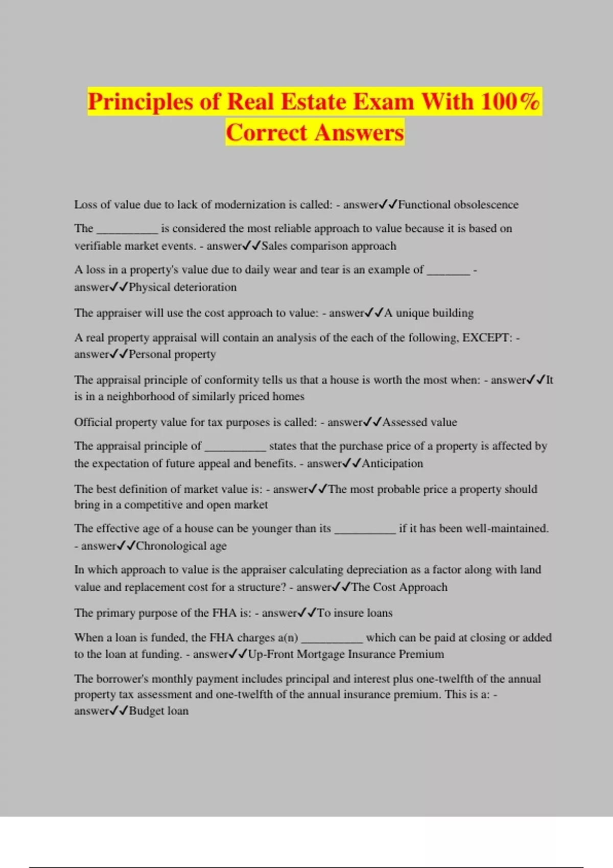 Principles of Real Estate Exam With 100% Correct Answers Loss of value due to lack of modernization is called: - answerFunctional obsolescence The __________ is considered the most reliable approach to value because it is based on verifiable market events. - answerSales comparison approach A loss in a property's value due to daily wear and tear is an example of _______ - answerPhysical deterioration The appraiser will use the cost approach to value: - answerA unique building A real property appraisal will contain an analysis of the each of the following, EXCEPT: - answerPersonal property The appraisal principle of conformity tells us that a house is worth the most when: - answerIt is in a neighborhood of similarly priced homes Official property value for tax purposes is called: - answerAssessed value The appraisal principle of __________ states that the purchase price of a property is affected by the expectation of future appeal and benefits. - answerAnticipation The best definition of market value is: - answerThe most probable price a property should bring in a competitive and open market The effective age of a house can be younger than its __________ if it has been well-maintained. - answerChronological age In which approach to value is the appraiser calculating depreciation as a factor along with land value and replacement cost for a structure? - answerThe Cost Approach The primary purpose of the FHA is: - answerTo insure loans When a loan is funded, the FHA charges a(n) __________ which can be paid at closing or added to the loan at funding. - answerUp-Front Mortgage Insurance Premium The borrower's monthly payment includes principal and interest plus one-twelfth of the annual property tax assessment and one-twelfth of the annual insurance premium. This is a: - answerBudget loan Which of the following statements about the use of gift funds in government loans is true? - answerProperty must be owner-occupied, Donor must be a relative, domestic partner, or fiancé, Gift funds may be used for the entire down payment A person who brings a borrower and a lender together for a fee is called: - answerA lender's agent Most of the specific requirements imp