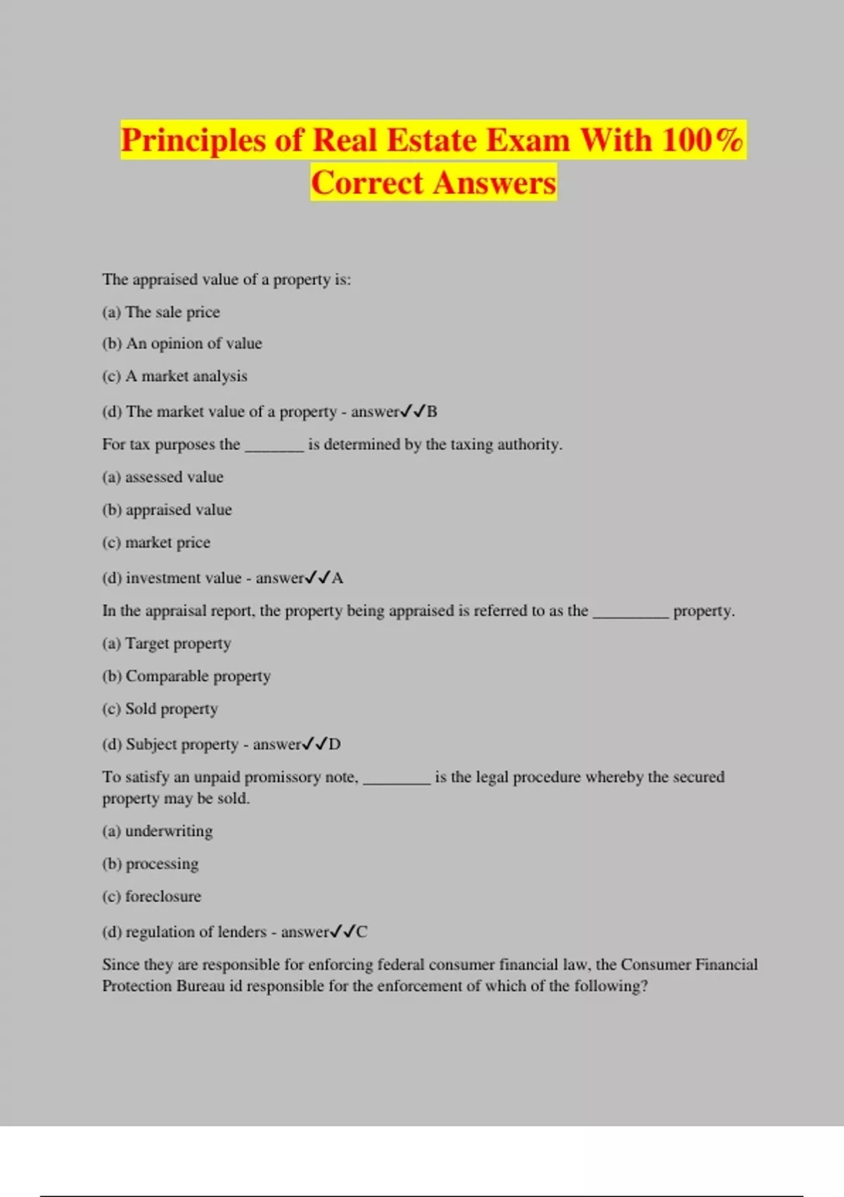 Principles of Real Estate Exam With 100% Correct Answers The appraised value of a property is: (a) The sale price (b) An opinion of value (c) A market analysis (d) The market value of a property - answerB For tax purposes the _______ is determined by the taxing authority. (a) assessed value (b) appraised value (c) market price (d) investment value - answerA In the appraisal report, the property being appraised is referred to as the _________ property. (a) Target property (b) Comparable property (c) Sold property (d) Subject property - answerD To satisfy an unpaid promissory note, ________ is the legal procedure whereby the secured property may be sold. (a) underwriting (b) processing (c) foreclosure (d) regulation of lenders - answerC Since they are responsible for enforcing federal consumer financial law, the Consumer Financial Protection Bureau id responsible for the enforcement of which of the following? (a) The Real Estate Settlement Procedures Act (b) The Fair Credit Reporting Act (c) The Truth In Lending Act (d) All of the above - answerd The investors assign large blocks of loans into _______ as collateral to back mortgage-backed securities. (a) originations (b) warehouse lines of credit (c) bonds (d) loan pools - answerD Located in between incompatible uses, a _______ is an area of land separating one land use from another, such as residential from c