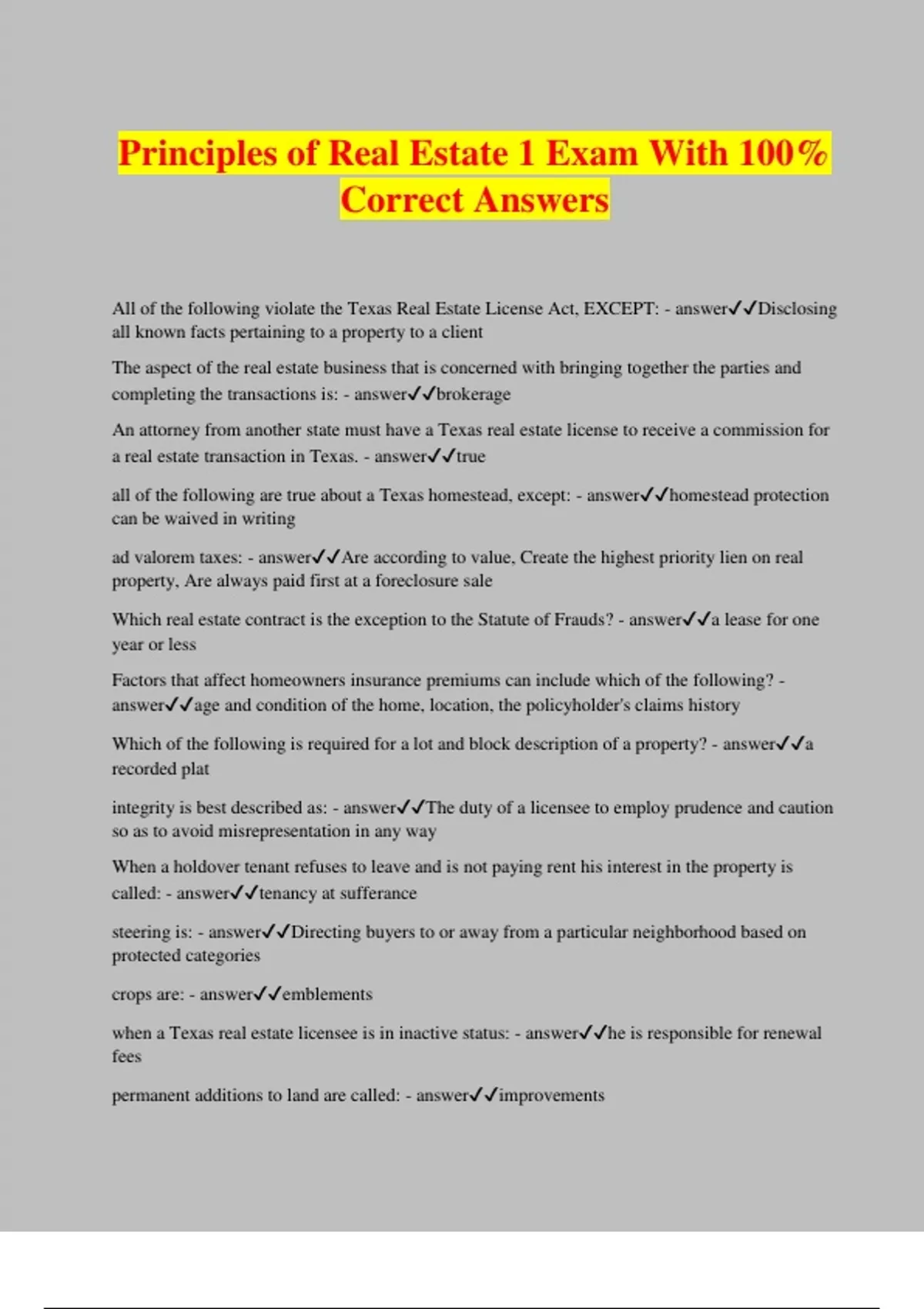 Principles of Real Estate 1 Exam With 100% Correct Answers All of the following violate the Texas Real Estate License Act, EXCEPT: - answerDisclosing all known facts pertaining to a property to a client The aspect of the real estate business that is concerned with bringing together the parties and completing the transactions is: - answerbrokerage An attorney from another state must have a Texas real estate license to receive a commission for a real estate transaction in Texas. - answertrue all of the following are true about a Texas homestead, except: - answerhomestead protection can be waived in writing ad valorem taxes: - answerAre according to value, Create the highest priority lien on real property, Are always paid first at a foreclosure sale Which real estate contract is the exception to the Statute of Frauds? - answera lease for one year or less Factors that affect homeowners insurance premiums can include which of the following? - answerage and condition of the home, location, the policyholder's claims history Which of the following is required for a lot and block description of a property? - answera recorded plat integrity is best described as: - answerThe duty of a licensee to employ prudence and caution so as to avoid misrepresentation in any way When a holdover tenant refuses to leave and is not paying rent his interest in the property is called: - answertenancy at sufferance steering is: - answerDirecting buyers to or away from a particular neighborhood based on protected categories crops are: - answeremblements when a Texas real estate licensee is in inactive status: - answerhe is responsible for renewal fees permanent additions to land are called: - answerimprovements
