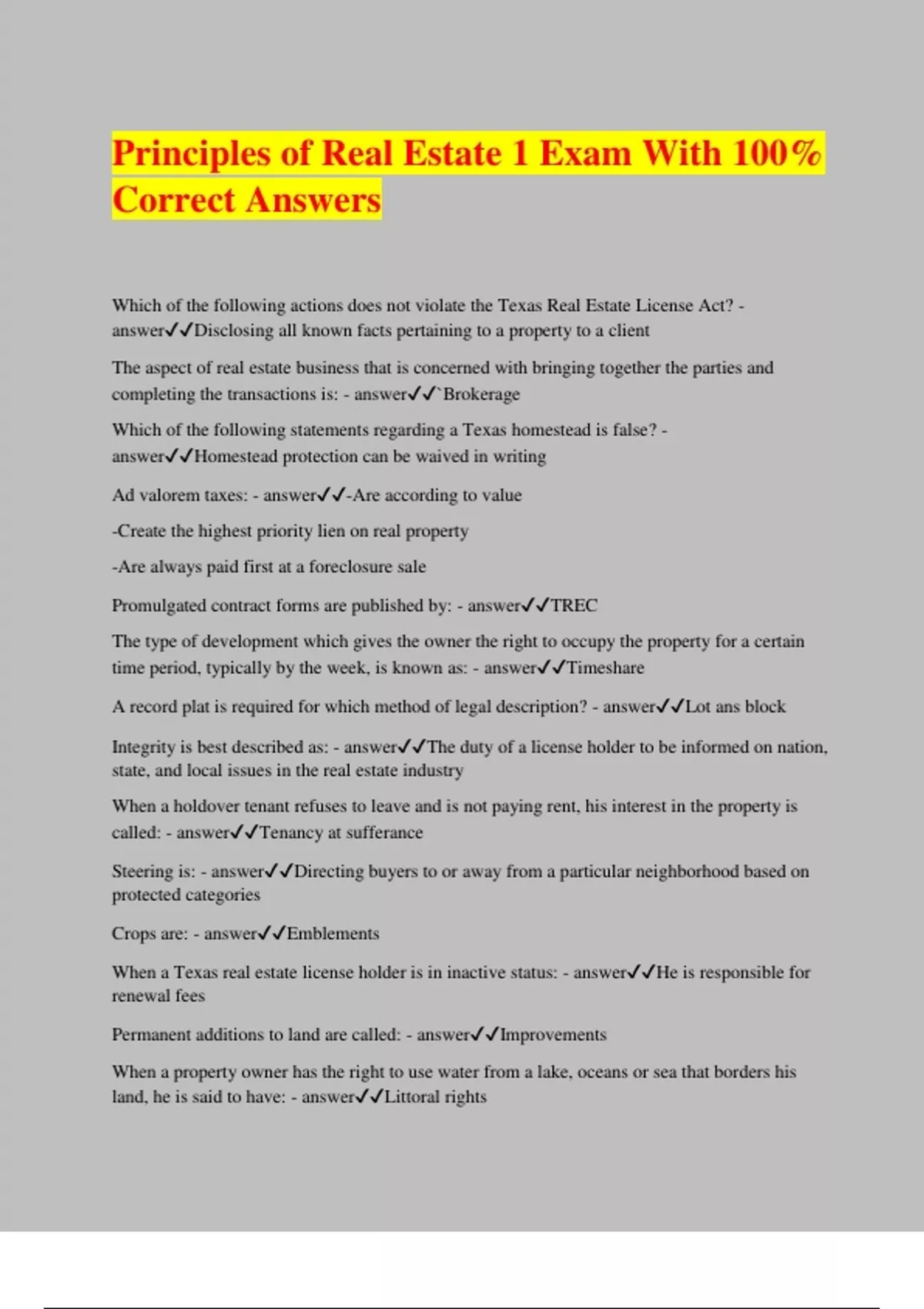Principles of Real Estate 1 Exam With 100% Correct Answers Which of the following actions does not violate the Texas Real Estate License Act? - answerDisclosing all known facts pertaining to a property to a client The aspect of real estate business that is concerned with bringing together the parties and completing the transactions is: - answer`Brokerage Which of the following statements regarding a Texas homestead is false? - answerHomestead protection can be waived in writing Ad valorem taxes: - answer-Are according to value -Create the highest priority lien on real property -Are always paid first at a foreclosure sale Promulgated contract forms are published by: - answerTREC The type of development which gives the owner the right to occupy the property for a certain time period, typically by the week, is known as: - answerTimeshare A record plat is required for which method of legal description? - answerLot ans block Integrity is best described as: - answerThe duty of a license holder to be informed on nation, state, and local issues in the real estate industry When a holdover tenant refuses to leave and is not paying rent, his interest in the property is called: - answerTenancy at sufferance Steering is: - answerDirecting buyers to or away from a particular neighborhood based on protected categories Crops are: - answerEmblements When a Texas real estate license holder is in inactive status: - answerHe is responsible for renewal fees Permanent additions to land are called: - answerImprovements When a property owner has the right to use water from a lake, oceans or sea that borders his land, he is said to have: - answerLittoral right