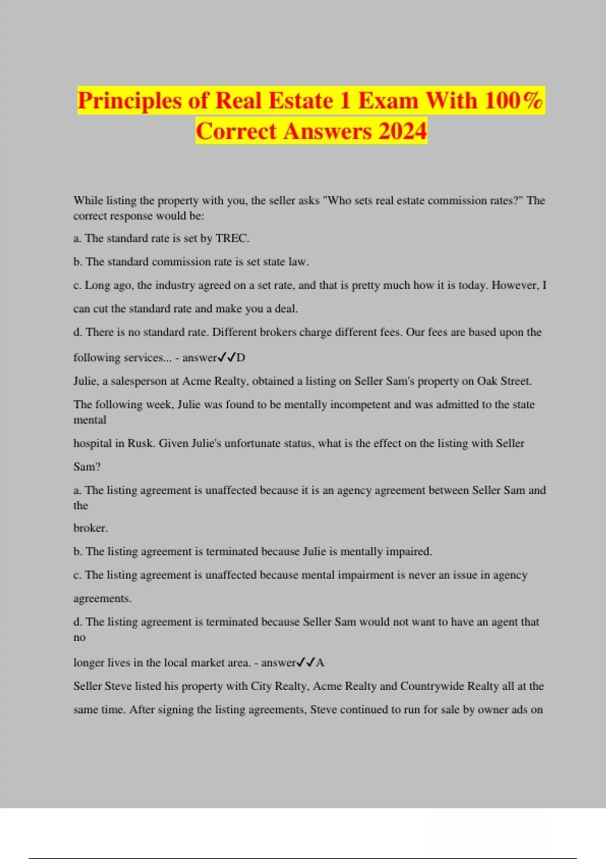 Principles of Real Estate 1 Exam With 100% Correct Answers 2024 While listing the property with you, the seller asks "Who sets real estate commission rates?" The correct response would be: a. The standard rate is set by TREC. b. The standard commission rate is set state law. c. Long ago, the industry agreed on a set rate, and that is pretty much how it is today. However, I can cut the standard rate and make you a deal. d. There is no standard rate. Different brokers charge different fees. Our fees are based upon the following services... - answerD Julie, a salesperson at Acme Realty, obtained a listing on Seller Sam's property on Oak Street. The following week, Julie was found to be mentally incompetent and was admitted to the state mental hospital in Rusk. Given Julie's unfortunate status, what is the effect on the listing with Seller Sam? a. The listing agreement is unaffected because it is an agency agreement between Seller Sam and the broker. b. The listing agreement is terminated because Julie is mentally impaired. c. The listing agreement is unaffected because mental impairment is never an issue in agency agreements. d. The listing agreement is terminated because Seller Sam would not want to have an agent that no longer lives in the local market area. - answerA Seller Steve listed his property with City Realty, Acme Realty and Countrywide Realty all at the same time. After signing the listing agreements, Steve continued to run for sale by owner ads on Craigslist. The type of listing agreement Steve signed with the various companies is a(n): a. Exclusive Right to Sell b. Exclusive Agency Agreement c. Open Listing d. Net Listing - answerC The type of listing agreement that affords the broker the greatest protection is the: a. Exclusive Right to Sell b. Exclusive Agency Agreement c. Open Listing d. Net Listing - answerA In order to successfully sue for commission: a. The broker must have a valid real estate license b. The broker must be the procuring cause of sale c. The broker must have an employment agreement signed by the party to be charged. d. All of the above - answerD Any attempt by competing brokers to fix commission rates in a given market area would be a violation of: a. RESPA b. SAFE Act c. Community Reinvestment Act d. Sherman Anti-Trust Act - answerD Lawsuits related to property defects are most often filed under the: a. Texas Defective Property Act b. Texas Deceptive Trade Practices Act c. Texas Fair Housing Act d. Texas Real Estate License Act - answerB When citing information such as square footage in an advertisement, the best source for the information is the: a. Seller b. Builder c. Architect d. Appraisal district or other tax authority - answerD The federal law that requires that states make available online information related to known sex offenders is: a. Sex Offender Disclosure Act (SODA) b. Megan's Law c. RESPA d. Dangerous Offenders Law - answerB A license holder is always liable for the misrepresentations of his or her principal. a. True b. False - answerB A property is owned by two unma