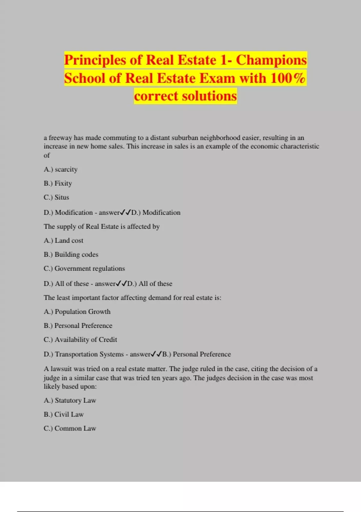 Principles of Real Estate 1- Champions School of Real Estate Exam with 100% correct solutions a freeway has made commuting to a distant suburban neighborhood easier, resulting in an increase in new home sales. This increase in sales is an example of the economic characteristic of A.) scarcity B.) Fixity C.) Situs D.) Modification - answerD.) Modification The supply of Real Estate is affected by A.) Land cost B.) Building codes C.) Government regulations D.) All of these - answerD.) All of these The least important factor affecting demand for real estate is: A.) Population Growth B.) Personal Preference C.) Availability of Credit D.) Transportation Systems - answerB.) Personal Preference A lawsuit was tried on a real estate matter. The judge ruled in the case, citing the decision of a judge in a similar case that was tried ten years ago. The judges decision in the case was most likely based upon: A.) Statutory Law B.) Civil Law C.) Common Law D.) Local ordinance - answerC.) Common Law A license holder was tried in a state district court on a complaint arising from a real estate transaction. The court ruled that, among other transgressions, the defendant had violated the Texas Real Estate License Act. This decision of the judge was based upon: A.) Statutory law B.) Civil Law C.) Common Law D.) Local Ordinance - answerA.) Statutory Law RMLOs in Texas are licensed through: A.) Texas Real Estate Commission B.) National Mortgage Bankers Association C.) Texas Department of Savings and Mortgage Lending D.) Texas savings and loan board - answerC.) Texas Department of Savings and Mortgage Lending A Freeway has made commuting to a distant suburban neighborhood easier, resulting in an increase in new home sales. This increase in sales is an example of the economic characteristics of: A.) Scarcity B.) Fixity C.) Situs D.) Modification - answerD.) Modification Air Rights are commonly leased or conveyed in: A.) Cell tower leases B.) Condominiums C.) Outdoor Advertising D.) All of these are correct - answerD) all of these Building, roads and fences are all examples of: A.) Personal Property B.) Private Property C.) Improvements D.) Public Property - answerC.) Improvements If a tenant fails to remove trade fixtures from the leased premises, the fixtures become the property of the landlord th