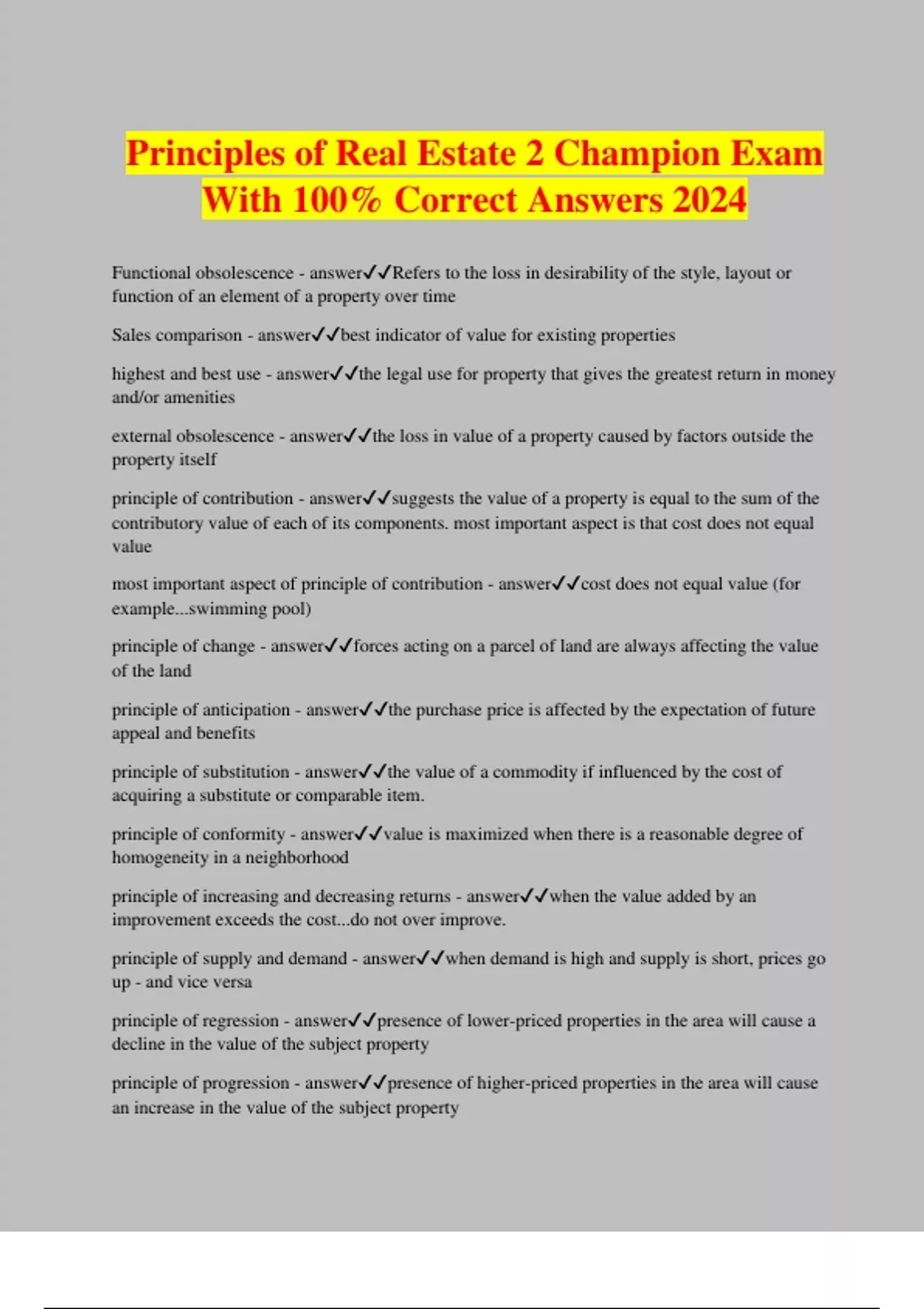 Principles of Real Estate 2 Champion Exam With 100% Correct Answers 2024 Functional obsolescence - answerRefers to the loss in desirability of the style, layout or function of an element of a property over time Sales comparison - answerbest indicator of value for existing properties highest and best use - answerthe legal use for property that gives the greatest return in money and/or amenities external obsolescence - answerthe loss in value of a property caused by factors outside the property itself principle of contribution - answersuggests the value of a property is equal to the sum of the contributory value of each of its components. most important aspect is that cost does not equal value most important aspect of principle of contribution - answercost does not equal value (for example...swimming pool) principle of change - answerforces acting on a parcel of land are always affecting the value of the land principle of anticipation - answerthe purchase price is affected by the expectation of future appeal and benefits principle of substitution - answerthe value of a commodity if influenced by the cost of acquiring a substitute or comparable item. principle of conformity - answervalue is maximized when there is a reasonable degree of homogeneity in a neighborhood principle of increasing and decreasing returns - answerwhen the value added by an improvement exceeds the cost...do not over improve. principle of supply and demand - answerwhen demand is high and supply is short, prices go up - and vice versa principle of regression - answerpresence of lower-priced properties in the area will cause a decline in the value of the subject property principle of progression - answerpresence of higher-priced properties in the area will cause an increase in the value of the subject property