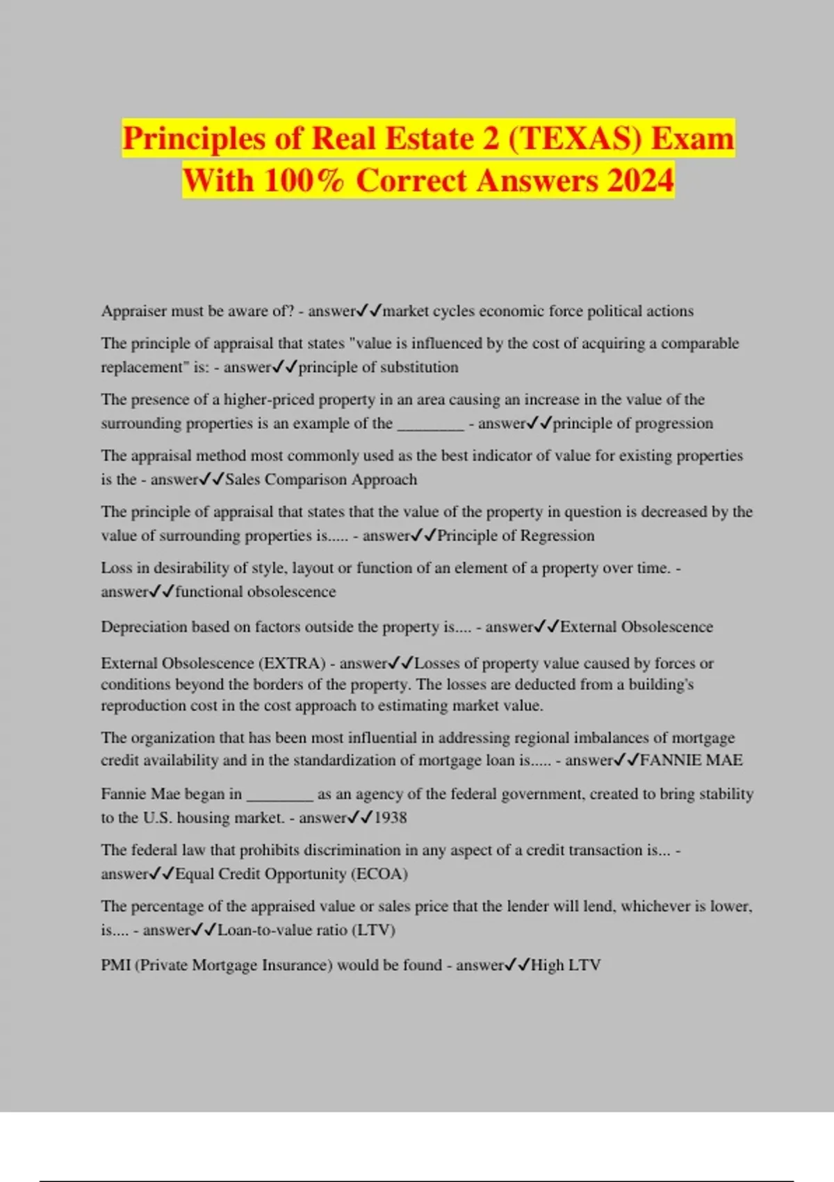 Principles of Real Estate 2 (TEXAS) Exam With 100% Correct Answers 2024 Appraiser must be aware of? - answermarket cycles economic force political actions The principle of appraisal that states "value is influenced by the cost of acquiring a comparable replacement" is: - answerprinciple of substitution The presence of a higher-priced property in an area causing an increase in the value of the surrounding properties is an example of the ________ - answerprinciple of progression The appraisal method most commonly used as the best indicator of value for existing properties is the - answerSales Comparison Approach The principle of appraisal that states that the value of the property in question is decreased by the value of surrounding properties is..... - answerPrinciple of Regression Loss in desirability of style, layout or function of an element of a property over time. - answerfunctional obsolescence Depreciation based on factors outside the property is.... - answerExternal Obsolescence External Obsolescence (EXTRA) - answerLosses of property value caused by forces or conditions beyond the borders of the property. The losses are deducted from a building's reproduction cost in the cost approach to estimating market value. The organization that has been most influential in addressing regional imbalances of mortgage credit availability and in the standardization of mortgage loan is..... - answerFANNIE MAE Fannie Mae began in ________ as an agency of the federal government, created to bring stability to the U.S. housing market. - answer1938 The federal law that prohibits discrimination in any aspect of a credit transaction is... - answerEqual Credit Opportunity (ECOA) The percentage of the appraised value or sales price that the lender will lend, whichever is lower, is.... - answerLoan-to-value ratio (LTV) PMI (Private Mortgage Insurance) would be found - answerHigh LTV