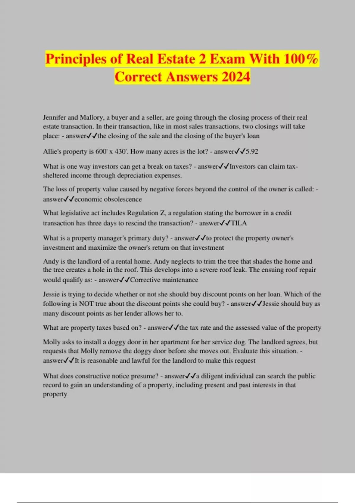 Principles of Real Estate 2 Exam With 100% Correct Answers 2024 Jennifer and Mallory, a buyer and a seller, are going through the closing process of their real estate transaction. In their transaction, like in most sales transactions, two closings will take place: - answerthe closing of the sale and the closing of the buyer's loan Allie's property is 600' x 430'. How many acres is the lot? - answer5.92 What is one way investors can get a break on taxes? - answerInvestors can claim tax- sheltered income through depreciation expenses. The loss of property value caused by negative forces beyond the control of the owner is called: - answereconomic obsolescence What legislative act includes Regulation Z, a regulation stating the borrower in a credit transaction has three days to rescind the transaction? - answerTILA What is a property manager's primary duty? - answerto protect the property owner's investment and maximize the owner's return on that investment Andy is the landlord of a rental home. Andy neglects to trim the tree that shades the home and the tree creates a hole in the roof. This develops into a severe roof leak. The ensuing roof repair would qualify as: - answerCorrective maintenance Jessie is trying to decide whether or not she should buy discount points on her loan. Which of the following is NOT true about the discount points she could buy? - answerJessie should buy as many discount points as her lender allows her to. What are property taxes based on? - answerthe tax rate and the assessed value of the property Molly asks to install a doggy door in her apartment for her service dog. The landlord agrees, but requests that Molly remove the doggy door before she moves out. Evaluate this situation. - answerIt is reasonable and lawful for the landlord to make this request What does constructive notice presume? - answera diligent individual can search the public record to gain an understanding of a property, including present and past interests in that property