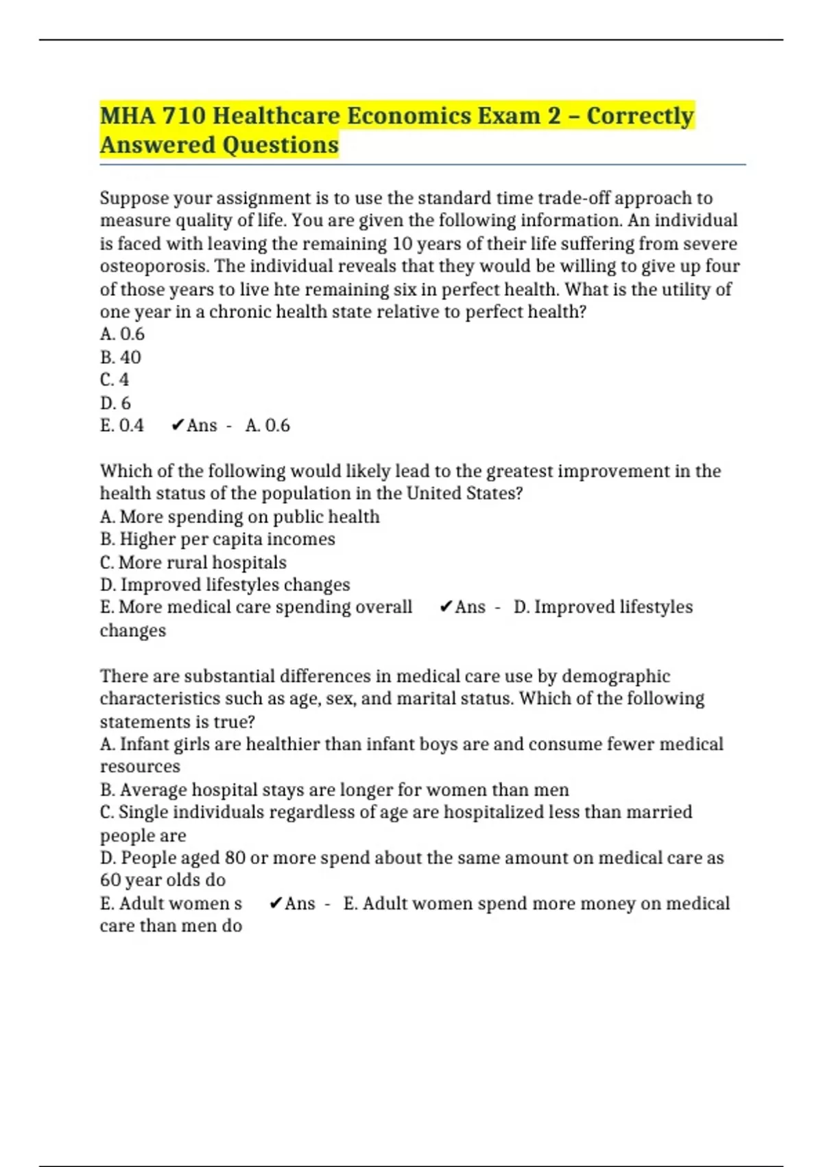 MHA 710 Healthcare Economics Exam 2 – Correctly Answered Questions