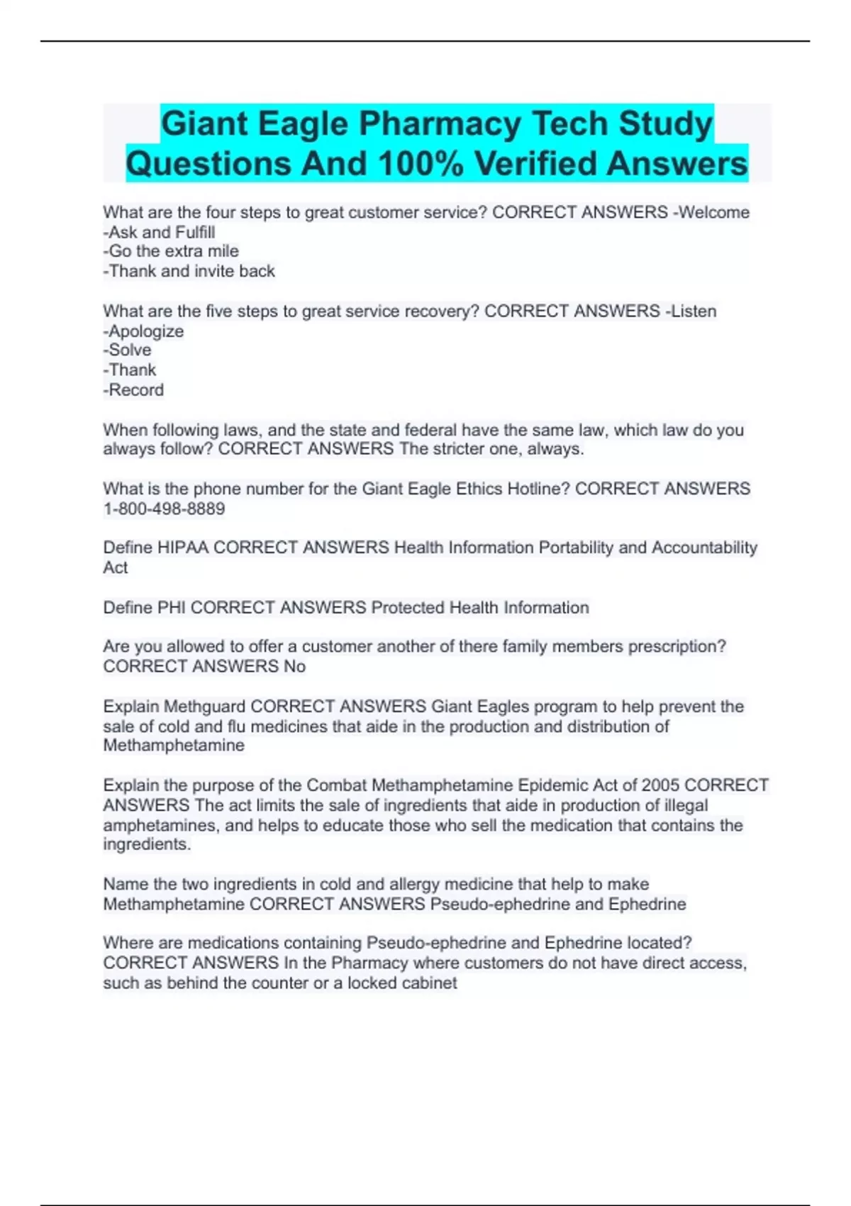 Giant Eagle Pharmacy Tech Study Questions And 100% Verified Answers