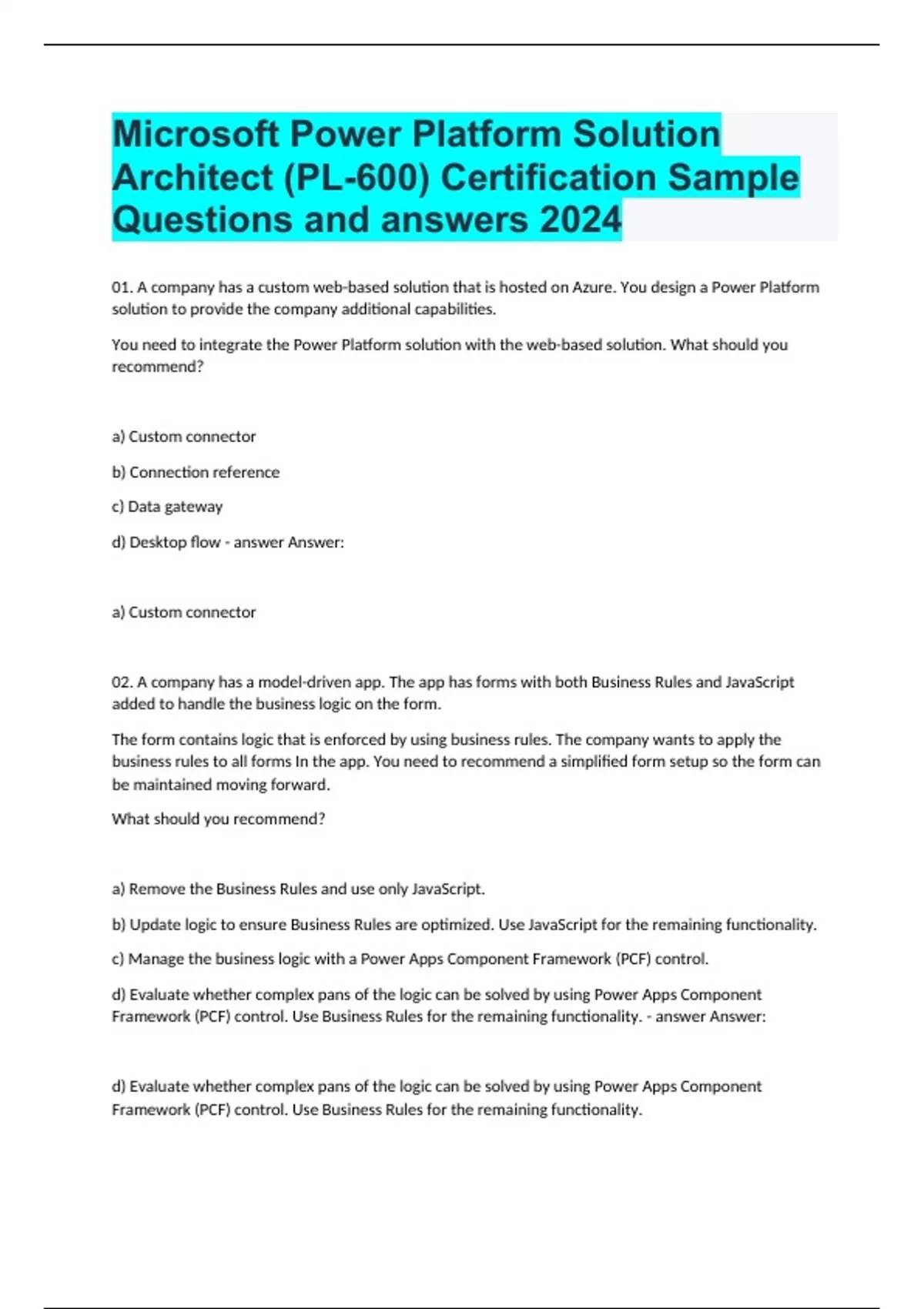 Microsoft Power Platform Solution Architect (PL-600) Certification Sample Questions and answers 2024