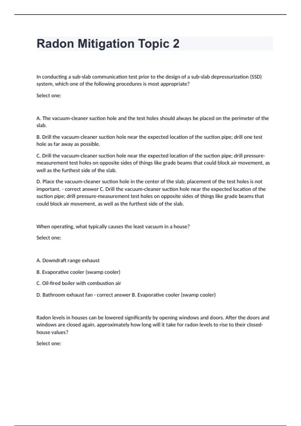 Radon Mitigation Topic 2 Question and answers rated A+ 2023/2024In conducting a sub-slab communication test prior to the design of a sub-slab depressurization (SSD) system, which one of the following procedures is most appropriate? Select one: A. The vacuum-cleaner suction hole and the test holes should always be placed on the perimeter of the slab. B. Drill the vacuum-cleaner suction hole near the expected location of the suction pipe; drill one test hole as far away as possible. C. Drill the vacuum-cleaner suction hole near the expected location of the suction pipe; drill pressure-measurement test holes on opposite sides of things like grade beams that could block air movement, as well as the furthest side of the slab. D. Place the vacuum-cleaner suction hole in the center of the slab; placement of the test holes is not important. - correct answer C. Drill the vacuum-cleaner suction hole near the expected location of the suction pipe; drill pressure-measurement test holes on opposite sides of things like grade beams that could block air movement, as well as the furthest side of the slab. When operating, what typically causes the least vacuum in a house? Select one: A. Downdraft range exhaust B. Evaporative cooler (swamp cooler) C. Oil-fired boiler with combustion air D. Bathroom exhaust fan - correct answer B. Evaporative cooler (swamp cooler) Radon levels in houses can be lowered significantly by opening windows and doors. After the doors and windows are closed again, approximately how long will it take for radon levels to rise to their closed-house values?
