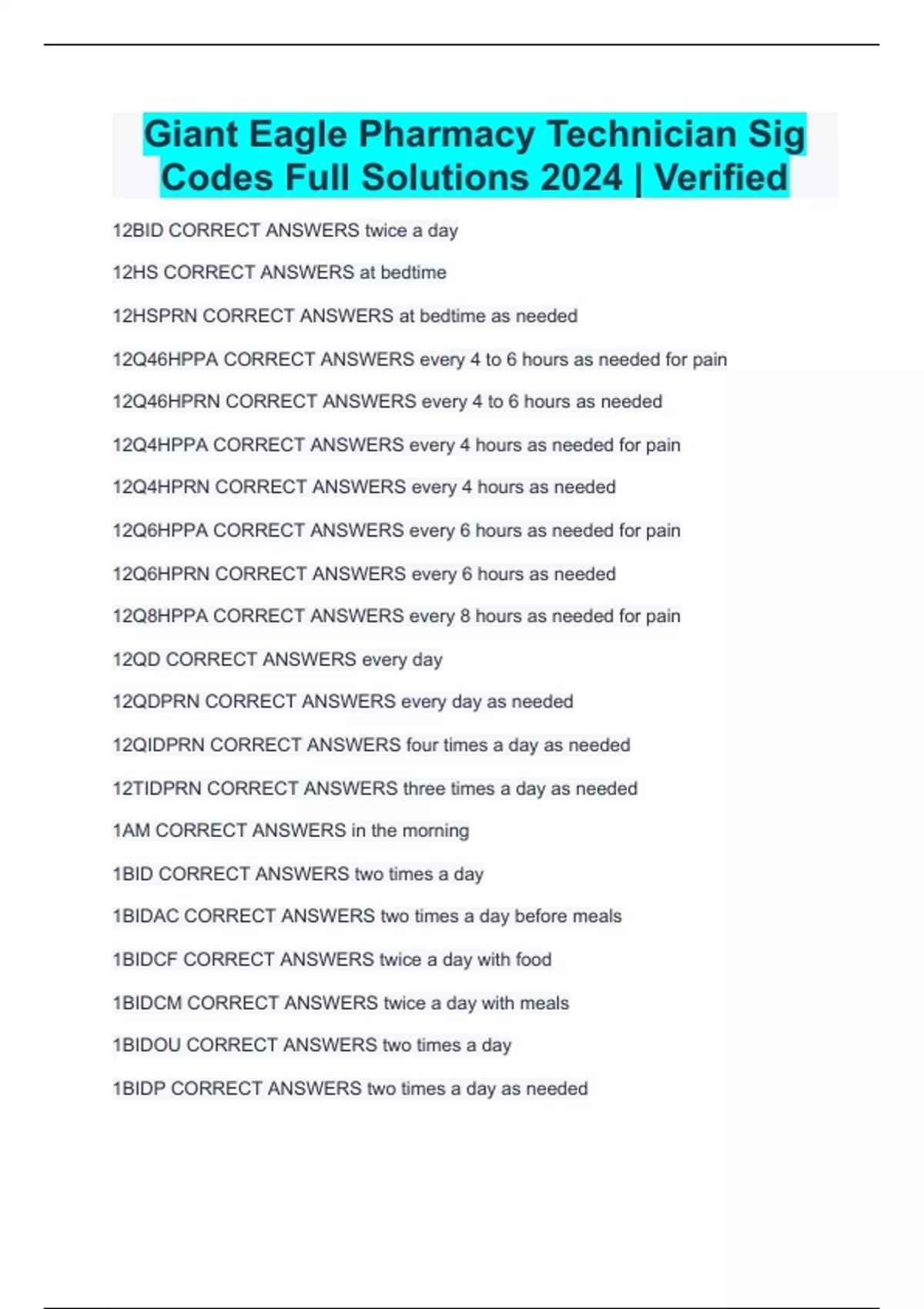 Giant Eagle Pharmacy Technician Sig Codes Full Solutions 2024 | Verified