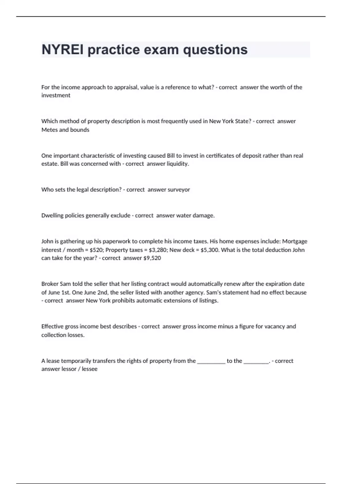 NYREI practice exam questions and answers 100% correct 2023/2024 For the income approach to appraisal, value is a reference to what? - correct answer the worth of the investment Which method of property description is most frequently used in New York State? - correct answer Metes and bounds One important characteristic of investing caused Bill to invest in certificates of deposit rather than real estate. Bill was concerned with - correct answer liquidity. Who sets the legal description? - correct answer surveyor Dwelling policies generally exclude - correct answer water damage. John is gathering up his paperwork to complete his income taxes. His home expenses include: Mortgage interest / month = $520; Property taxes = $3,280; New deck = $5,300. What is the total deduction John can take for the year? - correct answer $9,520 Broker Sam told the seller that her listing contract would automatically renew after the expiration date of June 1st. One June 2nd, the seller listed with another agency. Sam's statement had no effect because - correct answer New York prohibits automatic extensions of listings. Effective gross income best describes - correct answer gross income minus a figure for vacancy and collection losses.