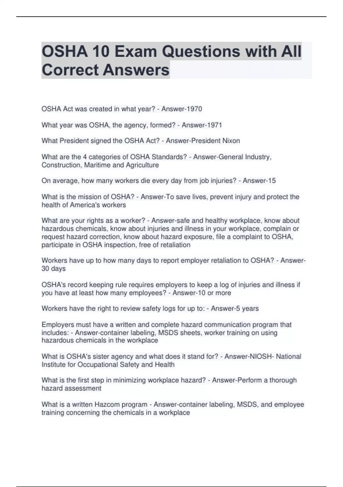 OSHA 10 Exam Questions with All Correct Answers OSHA Act was created in what year? - Answer-1970 What year was OSHA, the agency, formed? - Answer-1971 What President signed the OSHA Act? - Answer-President Nixon What are the 4 categories of OSHA Standards? - Answer-General Industry, Construction, Maritime and Agriculture On average, how many workers die every day from job injuries? - Answer-15 What is the mission of OSHA? - Answer-To save lives, prevent injury and protect the health of America's workers What are your rights as a worker? - Answer-safe and healthy workplace, know about hazardous chemicals, know about injuries and illness in your workplace, complain or request hazard correction, know about hazard exposure, file a complaint to OSHA, participate in OSHA inspection, free of retaliation Workers have up to how many days to report employer retaliation to OSHA? - Answer-30 days OSHA's record keeping rule requires employers to keep a log of injuries and illness if you have at least how many employees? - Answer-10 or more Workers have the right to review safety logs for up to: - Answer-5 years Employers must have a written and complete hazard communication program that includes: - Answer-container labeling, MSDS sheets, worker training on using hazardous chemicals in the workplace What is OSHA's sister agency and what does it stand for? - Answer-NIOSH- National Institute for Occupational Safety and Health