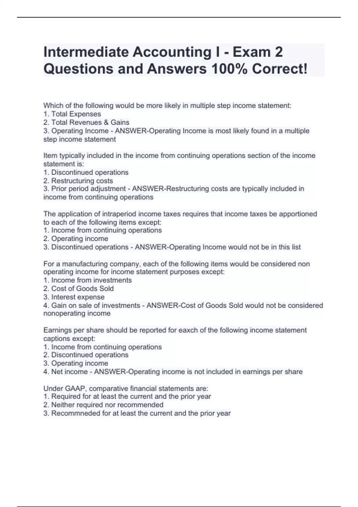 Which of the following would be more likely in multiple step income statement: 1. Total Expenses 2. Total Revenues & Gains 3. Operating Income - ANSWER-Operating Income is most likely found in a multiple step income statement Item typically included in the income from continuing operations section of the income statement is: 1. Discontinued operations 2. Restructuring costs 3. Prior period adjustment - ANSWER-Restructuring costs are typically included in income from continuing operations The application of intraperiod income taxes requires that income taxes be apportioned to each of the following items except: 1. Income from continuing operations 2. Operating income 3. Discontinued operations - ANSWER-Operating Income would not be in this list For a manufacturing company, each of the following items would be considered non operating income for income statement purposes except: 1. Income from investments 2. Cost of Goods Sold 3. Interest expense 4. Gain on sale of investments - ANSWER-Cost of Goods Sold would not be considered nonoperating income Earnings per share should be reported for eaxch of the following income statement captions except: 1. Income from continuing operations 2. Discontinued operations 3. Operating income 4. Net income - ANSWER-Operating income is not included in earnings per share Under GAAP, comparative financial statements are: 1. Required for at least the current and the prior year 2. Neither required nor recommended 3. Recommneded for at least the current and the prior year 4. Required for at least the current and the prior 2 years - ANSWER-Recommended for at least the current and the prior year The effect of a material transaction that is infrequent in occurrence but not unusual in nature should be presented separately as a componnent of income from continuing operatinos when the transaction results in a - ANSWER-To be extraordinary it must be both, since this is just one, should be put under income from continuing operations Major distinction between multiple step and single step income statemetn is the separation of: 1. Income tax expense and administrative expenses 2. COGS expense and admn exp. 3. Selling expenses 4. Operating and nonoperating data - ANSWER-Operating and nonoperating data, allows to see gross profit or loss One of the primary benefits of the multiple-step income statement over the single-step income statement ist aht the multiple-step income statement: 1. Recognizes no distinciton among types of costs or expenses 2. Shows gross margin and recognizes different types of costs and expenses 3. Always shows last year's figures in comparison with the current year 4. Discrimination between admin & selling exp. - ANSWER-Shows gross margin and recognizes different types of costs and expenses Which of the following transactions qualifies as a discontinued operation: 1. Planned and approved sale of a segment 2. Phasing out of a production line 3. Changes realted to tech improvements 4. Disposal of part of a line of business - ANSWER-Planned and approved sale of a segment Newt Co. sold a warehouse and used the proceeds to acquire a new warehouse. The excess of the proceeds over the carrying amount of the warehouse sold should be reported as: 1. Extraordinary gain, net of taxes 2. Part of continuing operations 3. Reduction of the ocst of the new warehouse 4. Gain from discontinued operations, net of income taxes - ANSWER-Part of continuing operations