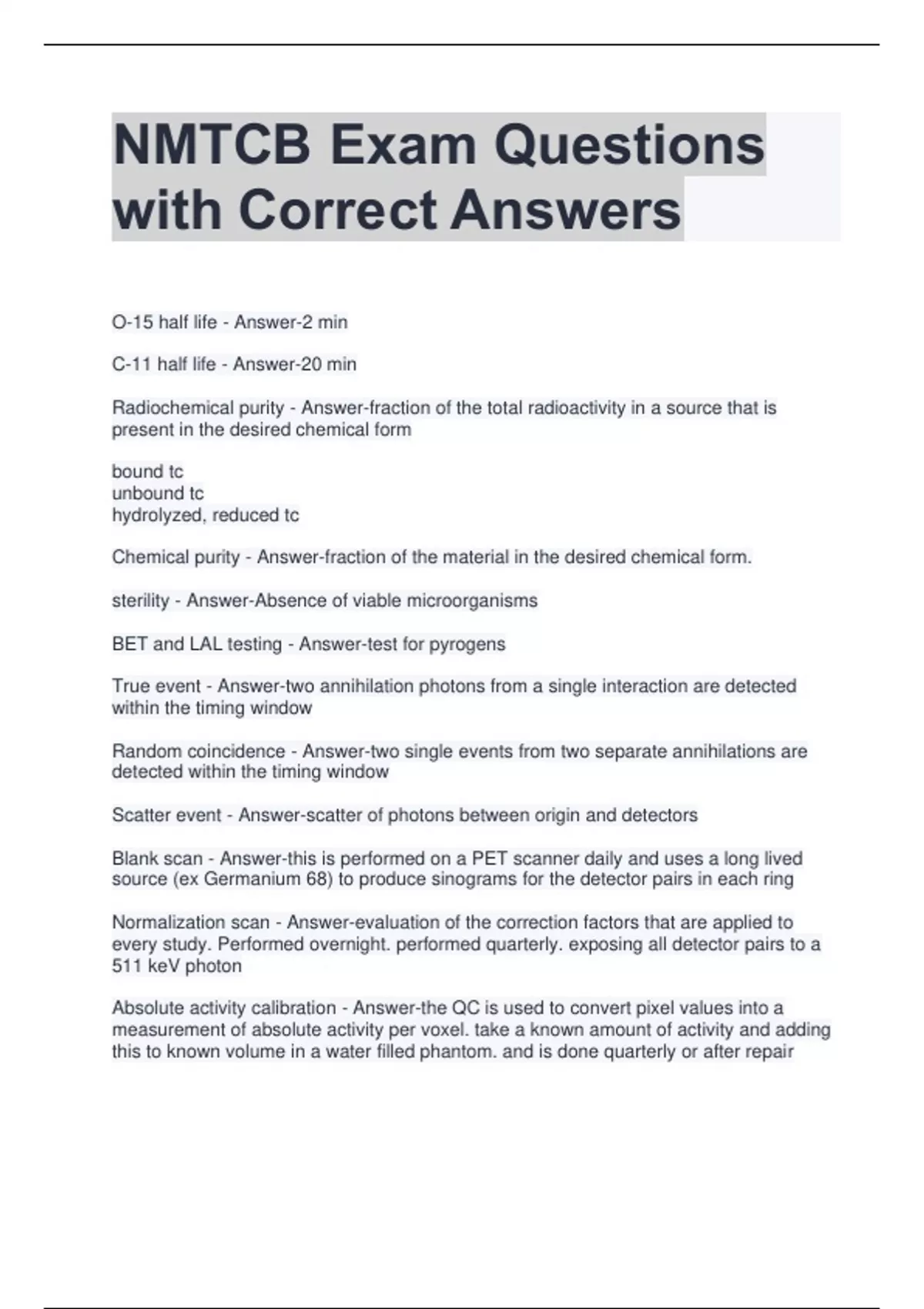 NMTCB Exam Questions with Correct Answers O-15 half life - Answer-2 min C-11 half life - Answer-20 min Radiochemical purity - Answer-fraction of the total radioactivity in a source that is present in the desired chemical form bound tc unbound tc hydrolyzed, reduced tc Chemical purity - Answer-fraction of the material in the desired chemical form. sterility - Answer-Absence of viable microorganisms BET and LAL testing - Answer-test for pyrogens True event - Answer-two annihilation photons from a single interaction are detected within the timing window Random coincidence - Answer-two single events from two separate annihilations are detected within the timing window Scatter event - Answer-scatter of photons between origin and detectors Blank scan - Answer-this is performed on a PET scanner daily and uses a long lived source (ex Germanium 68) to produce sinograms for the detector pairs in each ring Normalization scan - Answer-evaluation of the correction factors that are applied to every study. Performed overnight. performed quarterly. exposing all detector pairs to a 511 keV photon