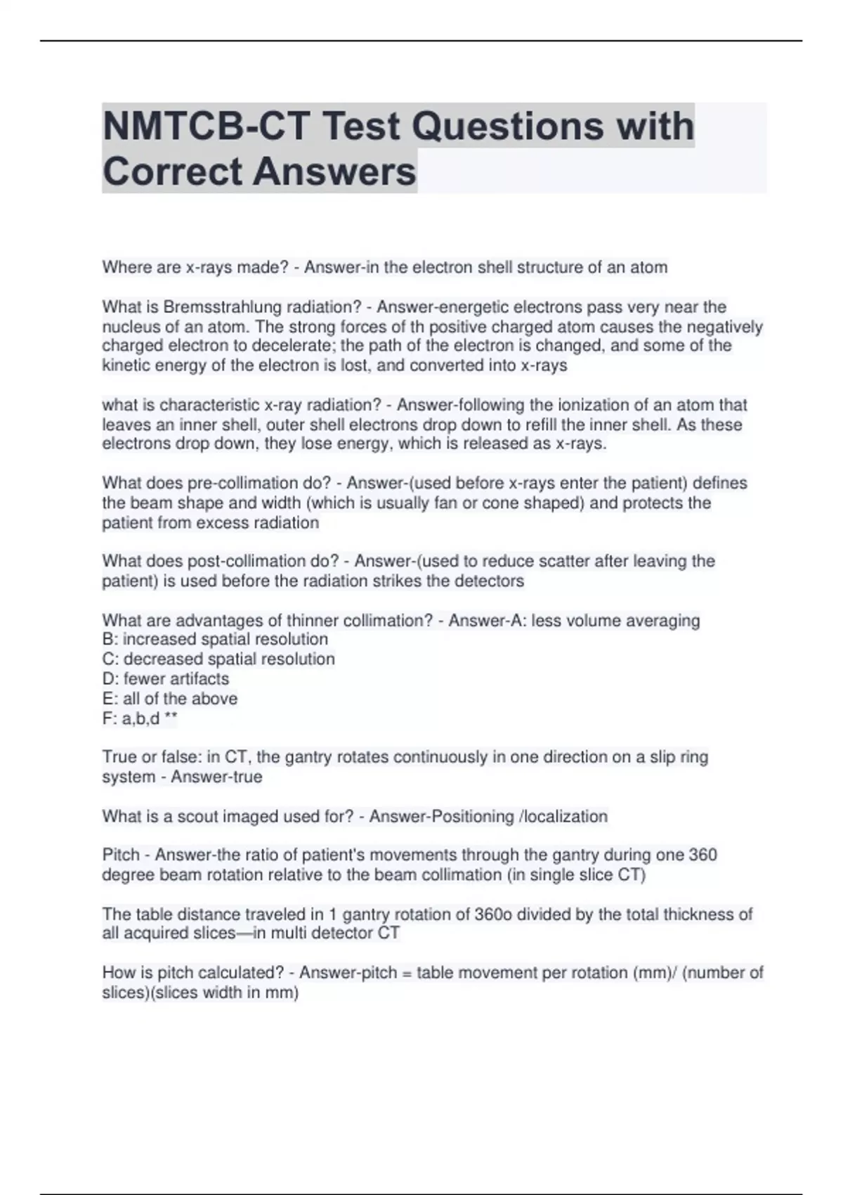 NMTCB-CT Test Questions with Correct Answers Where are x-rays made? - Answer-in the electron shell structure of an atom What is Bremsstrahlung radiation? - Answer-energetic electrons pass very near the nucleus of an atom. The strong forces of th positive charged atom causes the negatively charged electron to decelerate; the path of the electron is changed, and some of the kinetic energy of the electron is lost, and converted into x-rays what is characteristic x-ray radiation? - Answer-following the ionization of an atom that leaves an inner shell, outer shell electrons drop down to refill the inner shell. As these electrons drop down, they lose energy, which is released as x-rays. What does pre-collimation do? - Answer-(used before x-rays enter the patient) defines the beam shape and width (which is usually fan or cone shaped) and protects the patient from excess radiation What does post-collimation do? - Answer-(used to reduce scatter after leaving the patient) is used before the radiation strikes the detectors What are advantages of thinner collimation? - Answer-A: less volume averaging B: increased spatial resolution C: decreased spatial resolution D: fewer artifacts E: all of the above F: a,b,d ** True or false: in CT, the gantry rotates continuously in one direction on a slip ring system - Answer-true What is a scout imaged used for? - Answer-Positioning /localization