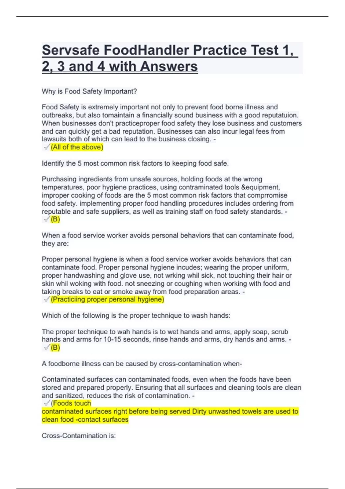 Servsafe FoodHandler Practice Test 1, 2, 3 and 4 with Answers