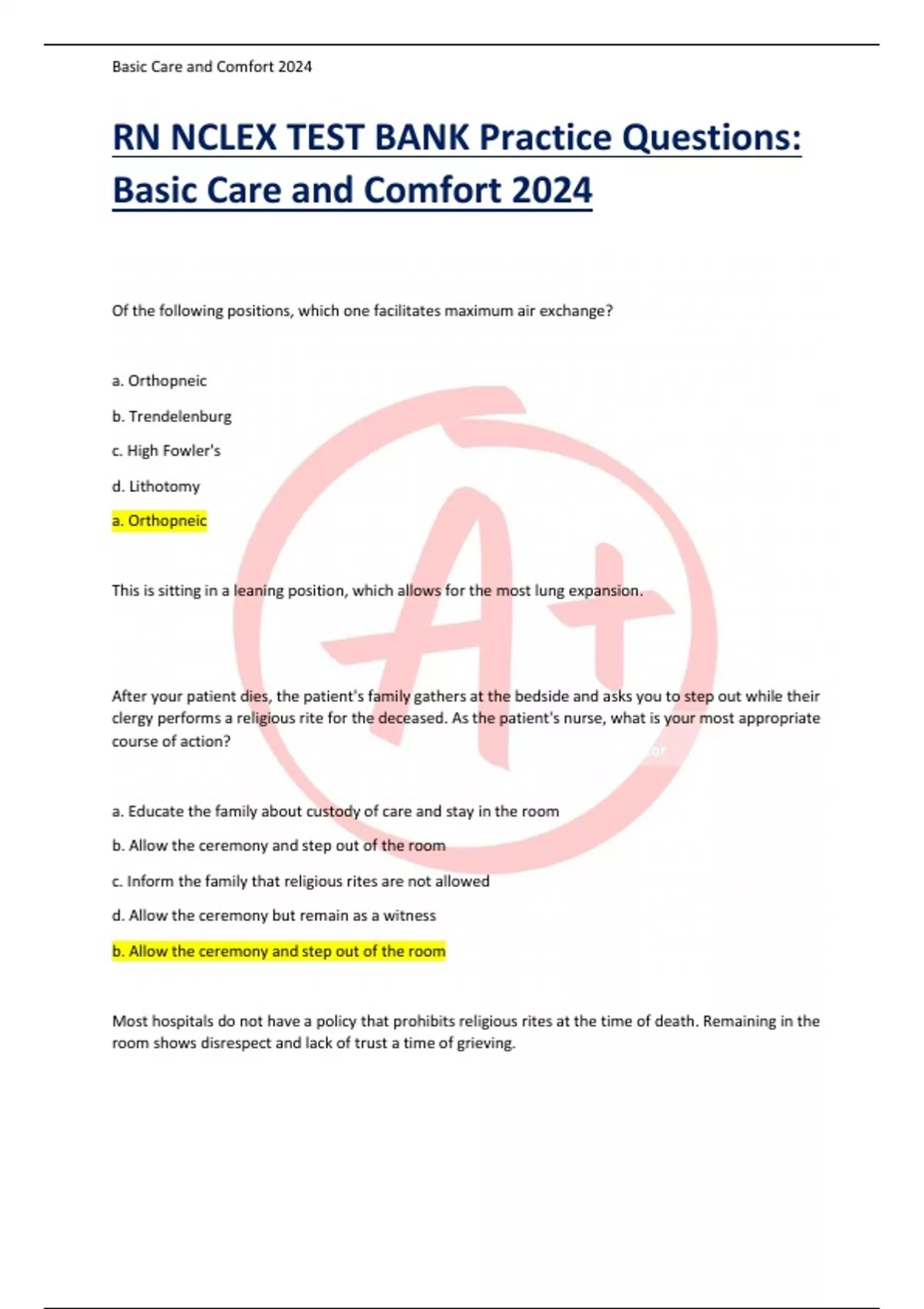 RN NCLEX TEST BANK Practice Questions: Basic Care and Comfort 2024 ALL ANSWERS ARE VERIFIED 100% GUARANTEED PASS 100%