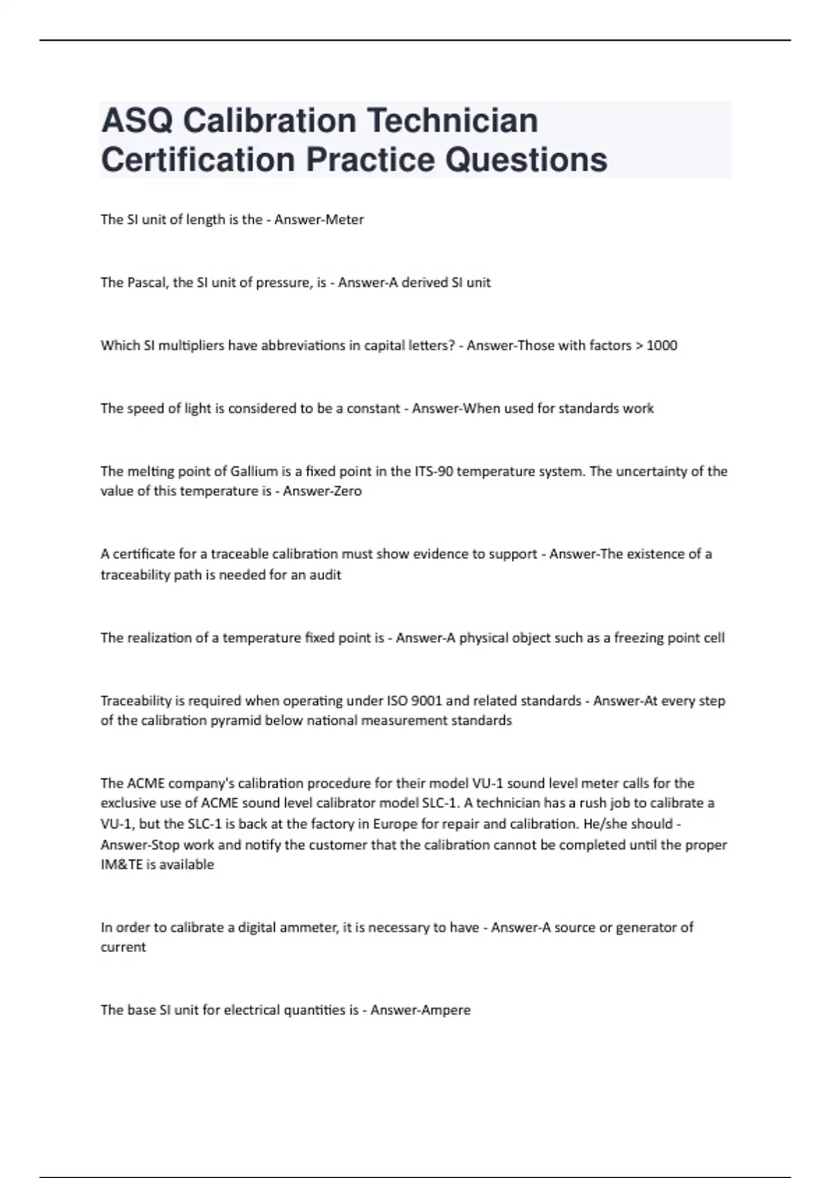 ASQ Calibration Technician Certification Practice Questions With 100% Correct Answers.