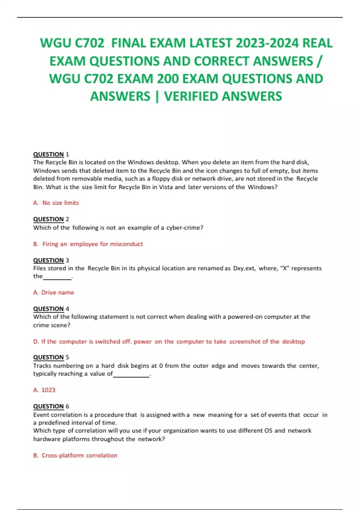 WGU C702 FINAL EXAM LATEST REAL EXAM QUESTIONS AND CORRECT ANSWERS / WGU C702 EXAM 200 EXAM QUESTIONS AND ANSWERS | VERIFIED ANSWERS QUESTION 1 The Recycle Bin is located on the Windows desktop. When you delete an item from the hard disk, Windows sends that deleted item to the Recycle Bin and the icon changes to full of empty, but items deleted from removable media, such as a floppy disk or network drive, are not stored in the Recycle Bin. What is the size limit for Recycle Bin in Vista and later versions of the Windows? A. No size limits QUESTION 2 Which of the following is not an example of a cyber-crime? B. Firing an employee for misconduct QUESTION 3 Files stored in the Recycle Bin in its physical location are renamed as D, where, “X" represents the . A. Drive name QUESTION 4 Which of the following statement is not correct when dealing with a powered-on computer at the crime scene? D. If the computer is switched off. power on the computer to take screenshot of the desktop QUESTION 5 Tracks numbering on a hard disk begins at 0 from the outer edge and moves towards the center, typically reaching a value of . A. 1023 QUESTION 6 Event correlation is a procedure that is assigned with a new meaning for a set of events that occur in a predefined interval of time. Which type of correlation will you use if your organization wants to use different OS and network hardware platforms throughout the network? B. Cross-platform correlation QUESTION 7 Which root folder (hive) of registry editor contains a vast array of configuration information for the system, including hardware settings and software settings? B. HKEY_CURRENT_USER QUESTION 8 Hard disk data addressing is a method of allotting addresses to each of data on a hard disk A. Physical block QUESTION 9 How do you define forensic computing? A. It is the science of capturing, processing, and investigating data security incidents and making it acceptable to a court of law. QUESTION 10 What is the smallest allocation unit of a hard disk? A. Cluster QUESTION 11 Which one of the following statements is not correct while preparing for testimony? B. Do not determine the basic facts of the case before beginning and examining the evidence QUESTION 12 Which of the following statements is not a part of securing and evaluating electronic crime scene checklist? D. Blog about the incident on the internet QUESTION 13 The Apache server saves diagnostic information and error messages that it encounters while processing requests. The default path of this file is usr/local/apache/logs/ in Linux. Identify the Apache error log from the following logs.