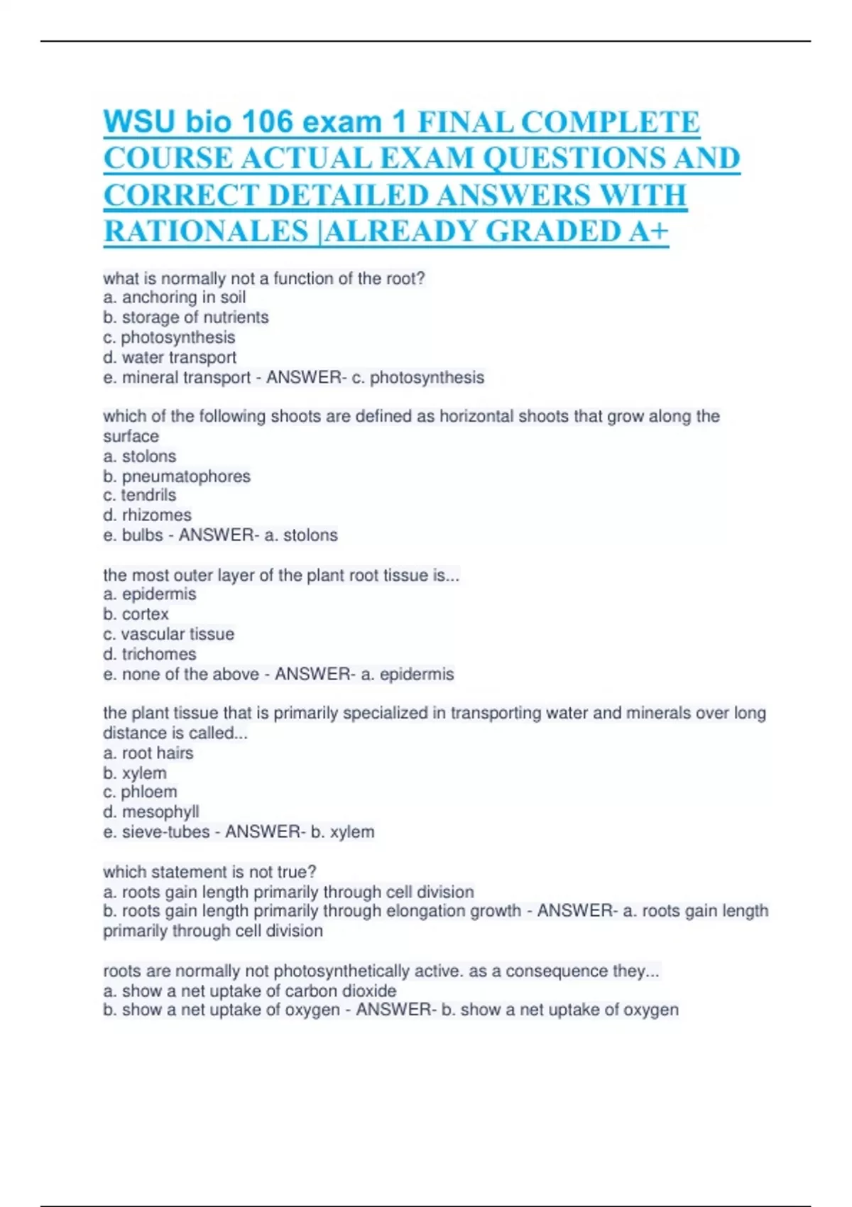 WSU bio 106 exam 1 FINAL COMPLETE COURSE ACTUAL EXAM QUESTIONS AND CORRECT DETAILED ANSWERS WITH RATIONALES |ALREADY GRADED A+ what is normally not a function of the root? a. anchoring in soil b. storage of nutrients c. photosynthesis d. water transport e. mineral transport - ANSWER- c. photosynthesis which of the following shoots are defined as horizontal shoots that grow along the surface a. stolons b. pneumatophores c. tendrils d. rhizomes e. bulbs - ANSWER- a. stolons the most outer layer of the plant root tissue is... a. epidermis b. cortex c. vascular tissue d. trichomes e. none of the above - ANSWER- a. epidermis the plant tissue that is primarily specialized in transporting water and minerals over long distance is called... a. root hairs b. xylem c. phloem d. mesophyll e. sieve-tubes - ANSWER- b. xylem which statement is not true? a. roots gain length primarily through cell division b. roots gain length primarily through elongation growth - ANSWER- a. roots gain length primarily through cell division roots are normally not photosynthetically active. as a consequence they... a. show a net uptake of carbon dioxide b. show a net uptake of oxygen - ANSWER- b. show a net uptake of oxygen what is the difference between apical and lateral meristems? a. apical meristems are involved with the growth of the plant while lateral meristems are involved with the transport of food and water b. apical meristems allow the plant to grow up and lateral meristems allow the plant to grow out c. lateral meristems are involved with the growth of the plant while apical meristems are involved with the transport of food and water al meristems allow the plant to grow up and apical meristems allow the plant to grow out - ANSWER- b. apical meristems allow the plant to grow up and lateral meristems allow the plant to grow out What are meristems? a. tissues in most plants containing undifferentiated cells, found in zones of the plant where growth can take place b. stem cell areas of dark heartwood, surrounded by light sapwood c. tissues that have no identity, that generate dermal, ground and vascular tissue, but stop being active after embryogenesis d. leaf stems that continuously produce new cells to enable plant growth - ANSWER- a. tissues in most plants containing undifferentiated cells, found in zones of the plant where growth can take place what would you normally not find in the root? a. endodermis b. epidermis c. pericycle d. stomata e. apical mersitem - ANSWER- d. stomata phloem sap in contrast to xylem sap normally mainly contains a. water and amino acids b. water and sugar c. sugar and minerals d. water and minerals - ANSWER- b. water and sugar what does the majority of the dry weight of a plant body contain, and where does it come from a. water and soil b. carbon and air c. phosphate and photosynthesis d. minerals and soil e. oxygen and air - ANSWER- b. carbon and air movement of the H20 through the cell wall happens in the... a. apoplast b. symplast c. symplast and apoplast d. tonoplast e. none of the above - ANSWER- a. apoplast the casparian strip in the endodermis blocks which pathway a. apoplast b. symplast - ANSWER- a. apoplast Which of the following statements is true? 1. the apoplastic movement of water occurs exclusively through the cell wall and adjacent spaces without passing through a membrane 2. solutes present in a cell (or in any solution) increase the water potential 3. the symplastic movement occurs from cell to cell via plasmodesmata 4. membrane permeability depends on the membrane composition and the chemical nature of the solute a. 1,2 and 3 only b. 2 and 4 only c. 1 and 2 only d. 1,3 and 4 only - ANSWER- d. 1,3 and 4 only which of the following processes likely depends in the activity of the proton pump? 1. sugar uptake 2. potassium uptake 3. water movement across a membrane a. 1 is correct b. 2 is correct c. 3 is correct d. two of the above are correct e. three of the above are correct - ANSWER- d. two of the above are correct As light intensity increases, the transpiration rate _______. The stomata _______ to allow more carbon dioxide into the leaf for photosynthesis. a. increases, close b. decreases, open c. decreases, close d. increases, open - ANSWER- d. increases, open