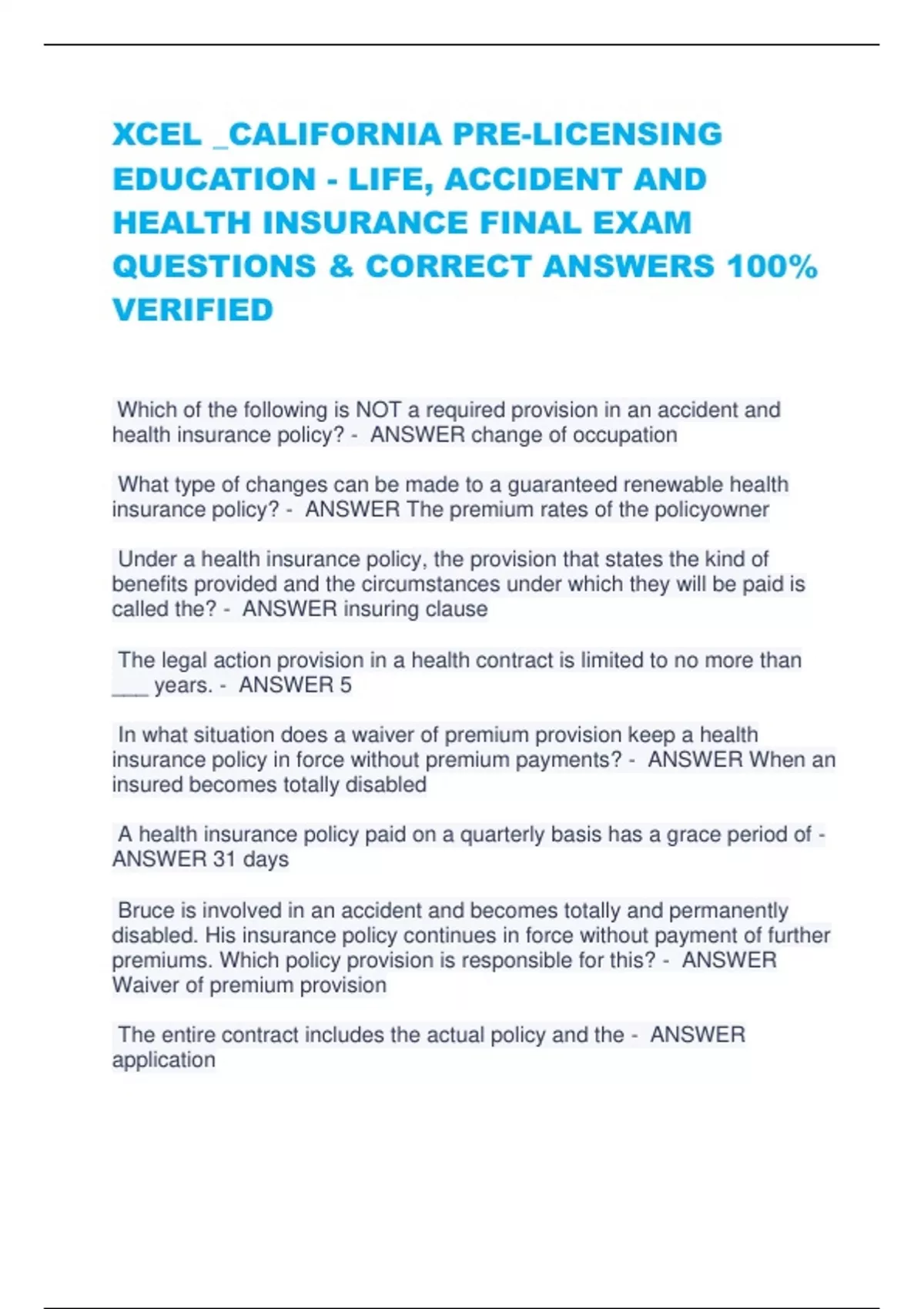 XCEL _CALIFORNIA PRE-LICENSING EDUCATION - LIFE, ACCIDENT AND HEALTH INSURANCE FINAL EXAM QUESTIONS & CORRECT ANSWERS 100% VERIFIED Which of the following is NOT a required provision in an accident and health insurance policy? - ANSWER change of occupation What type of changes can be made to a guaranteed renewable health insurance policy? - ANSWER The premium rates of the policyowner Under a health insurance policy, the provision that states the kind of benefits provided and the circumstances under which they will be paid is called the? - ANSWER insuring clause The legal action provision in a health contract is limited to no more than ___ years. - ANSWER 5 In what situation does a waiver of premium provision keep a health insurance policy in force without premium payments? - ANSWER When an insured becomes totally disabled A health insurance policy paid on a quarterly basis has a grace period of - ANSWER 31 days Bruce is involved in an accident and becomes totally and permanently disabled. His insurance policy continues in force without payment of further premiums. Which policy provision is responsible for this? - ANSWER Waiver of premium provision The entire contract includes the actual policy and the - ANSWER application In contrast to a guaranteed renewable policy, a noncancellable policy - ANSWER may never raise premiums The type of policy where the insurer can send a notice to the insured that the policy has been cancelled in the middle of the term is called - ANSWER cancelable Disability Income plans which require that the insurer can NEVER change or alter premium rates are usually considered - ANSWER Noncancellable Which of the following actions may an insurance company NOT do in a health policy that contains a guaranteed renewable premium benefit? - ANSWER Increase the premiums on an individual basis This MANDATORY health policy provision states that the policy, including endorsements and attached papers, constitutes - ANSWER the entire insurance contract between the parties In group health care, what is the purpose of the coordination of benefits provision? - ANSWER Determines what is paid by the primary and secondary insurers in the event of a claim