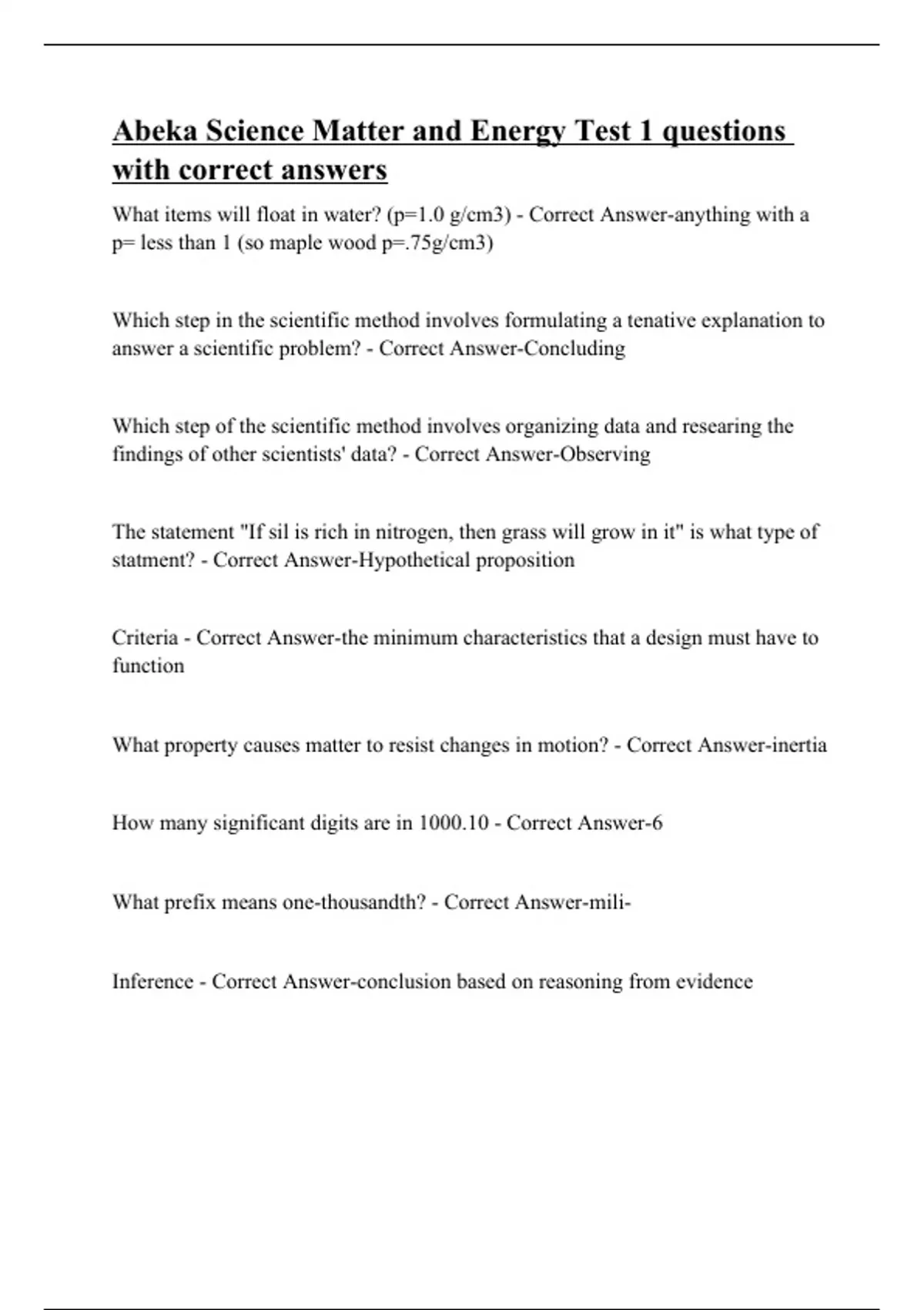 What items will float in water? (p=1.0 g/cm3) - Correct Answer-anything with a p= less than 1 (so maple wood p=.75g/cm3) Which step in the scientific method involves formulating a tenative explanation to answer a scientific problem? - Correct Answer-Concluding Which step of the scientific method involves organizing data and researing the findings of other scientists' data? - Correct Answer-Observing The statement "If sil is rich in nitrogen, then grass will grow in it" is what type of statment? - Correct Answer-Hypothetical proposition Criteria - Correct Answer-the minimum characteristics that a design must have to function What property causes matter to resist changes in motion? - Correct Answer-inertia How many significant digits are in 1000.10 - Correct Answer-6 What prefix means one-thousandth? - Correct Answer-mili- Inference - Correct Answer-conclusion base