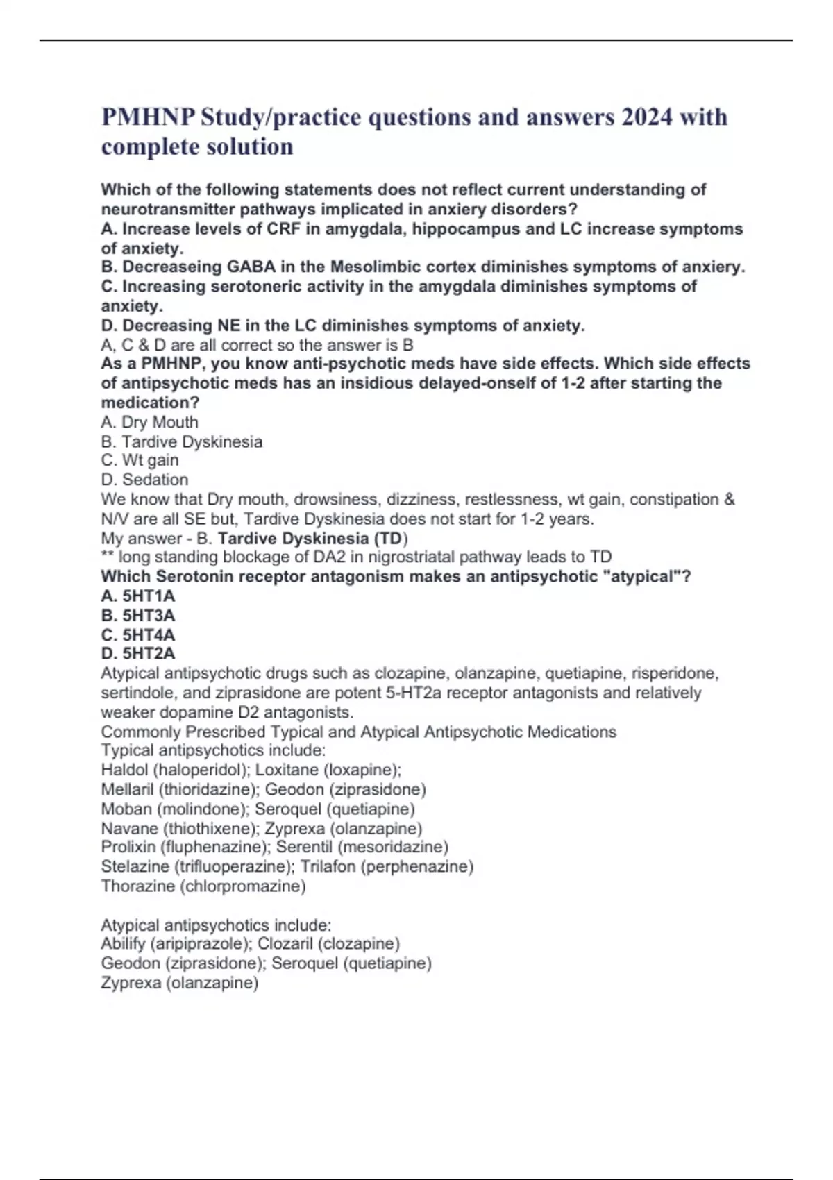 PMHNP Study/practice questions and answers 2024 with complete solution Which of the following statements does not reflect current understanding of neurotransmitter pathways implicated in anxiery disorders? A. Increase levels of CRF in amygdala, hippocampus and LC increase symptoms of anxiety. B. Decreaseing GABA in the Mesolimbic cortex diminishes symptoms of anxiery. C. Increasing serotoneric activity in the amygdala diminishes symptoms of anxiety. D. Decreasing NE in the LC diminishes symptoms of anxiety. A, C & D are all correct so the answer is B As a PMHNP, you know anti-psychotic meds have side effects. Which side effects of antipsychotic meds has an insidious delayed-onself of 1-2 after starting the medication? A. Dry Mouth