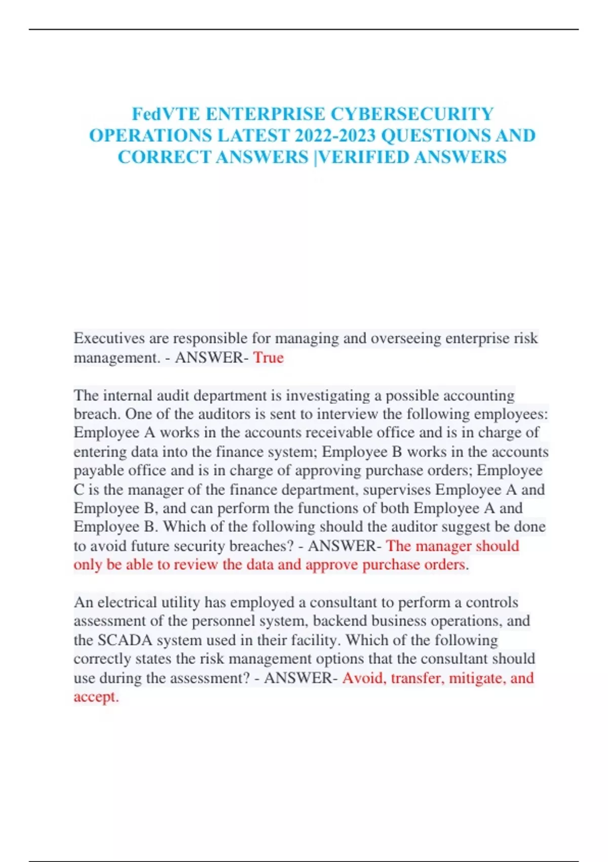 FedVTE ENTERPRISE CYBERSECURITY OPERATIONS LATEST QUESTIONS AND CORRECT ANSWERS |VERIFIED ANSWERS Executives are responsible for managing and overseeing enterprise risk management. - ANSWER- True The internal audit department is investigating a possible accounting breach. One of the auditors is sent to interview the following employees: Employee A works in the accounts receivable office and is in charge of entering data into the finance system; Employee B works in the accounts payable office and is in charge of approving purchase orders; Employee C is the manager of the finance department, supervises Employee A and Employee B, and can perform the functions of both Employee A and Employee B. Which of the following should the auditor suggest be done to avoid future security breaches? - ANSWER- The manager should only be able to review the data and approve purchase orders. An electrical utility has employed a consultant to perform a controls assessment of the personnel system, backend business operations, and the SCADA system used in their facility. Which of the following correctly states the risk management options that the consultant should use during the assessment? - ANSWER- Avoid, transfer, mitigate, and accept. The acronym SOA stands for: - ANSWER- Statement of Applicability Which of the following are steps in the risk management process? - ANSWER- All of the Above Cybersecurity should be involved throughout the entire system development life cycle. - ANSWER- True A Physical Security Manager is ready to replace 30 analog surveillance cameras with IP cameras with built in web management. There are several security guard desks on different networks that must be able to view the cameras without unauthorized people viewing the video as well. The selected IP camera vendor does not have the ability to authenticate users at the camera level. Which of the following should be used to BEST secure this environment? - ANSWER- Create an IP camera network and deploy a proxy to authenticate users prior to accessing the cameras. What is an advantage of cloud computing? - ANSWER- Improved performance Cybersecurity is primarily about implementing a checklist of requirements. - ANSWER- False A retail merchant has had a number of issues in regards to the integrity of sensitive information across all of its customer databases. This has resulted in the merchants share price decreasing in value by more than one third and the merchant has been threatened with losing their ability to process credit card transactions. The new Chief Information Security Officer (CISO) as a result has initiated a program of work to solve the issues. The business has specified that the solution needs to be enterprise grade and meet the following requirements: Work across all major platforms, applications and infrastructure; Tracks activity of all users, including administrators; Operates without negatively impacting the performance of production platforms, applications, and infrastructures; Provides real-time incident reporting; Displays incidents in a dashboard view for easy recognition; Includes a report generator where business units are able to query against companys system assets. In order to solve this problem, which of the following security solutions will BEST meet the above requirements? - ANSWER- Implement an enterprise-based SIEM solution to process the logs of the major platforms, applications, and infrastructure. Open source material is a good resource for gathering substantial information on a desired target. - ANSWER- True The agile process emphasizes which of the following over processes and tools? - ANSWER- Individuals and Interactions Jurisdiction and Breach Notification are examples of what type of potential risk? - ANSWER- Legal Which of the following is considered the necessary research done before launching a scan? - ANSWER- Network Reconnaissance Cloud computing does NOT require a constant Internet connection. - ANSWER- False