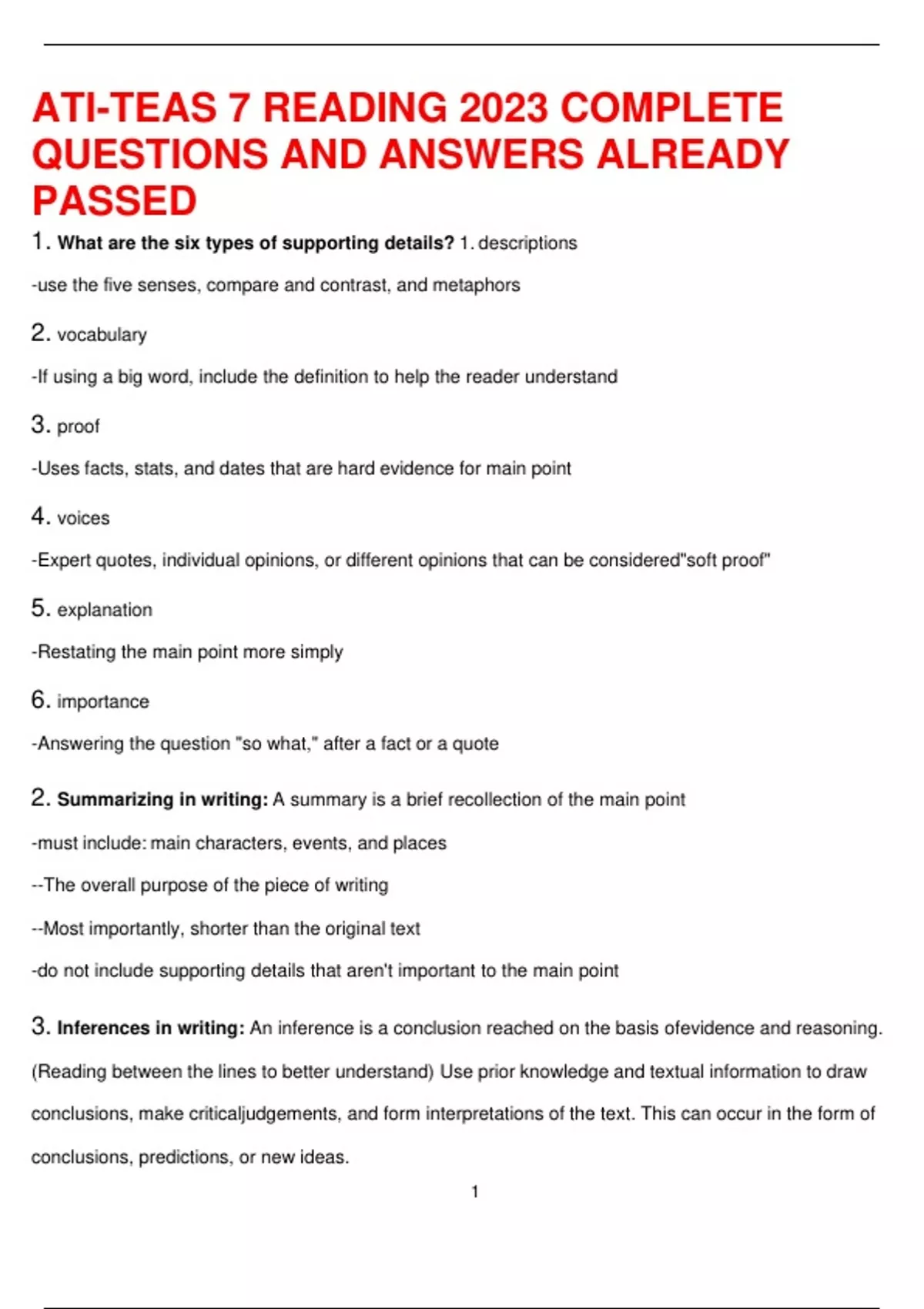 ATI-TEAS 7 READING 2023 COMPLETE QUESTIONS AND ANSWERS ALREADY PASSED