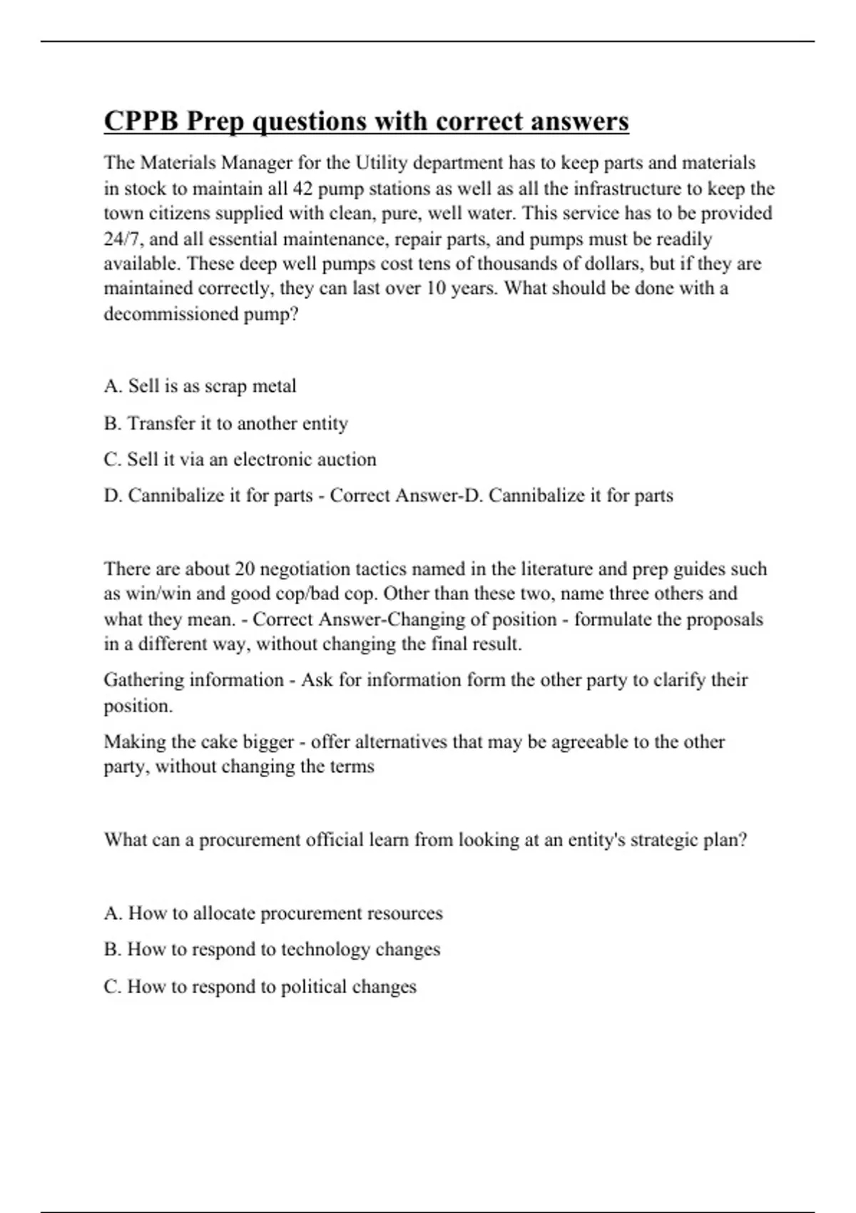 The Materials Manager for the Utility department has to keep parts and materials in stock to maintain all 42 pump stations as well as all the infrastructure to keep the town citizens supplied with clean, pure, well water. This service has to be provided 24/7, and all essential maintenance, repair parts, and pumps must be readily available. These deep well pumps cost tens of thousands of dollars, but if they are maintained correctly, they can last over 10 years. What should be done with a decommissioned pump? A. Sell is as scrap metal B. Transfer it to another entity C. Sell it via an electronic auction D. Cannibalize it for parts - Correct Answer-D. Cannibalize it for parts There are about 20 negotiation tactics named in the literature and prep guides such as win/win and good cop/bad cop. Other than these two, name three others and what they mean. - Correct Answer-Changing of position - formulate the proposals in a different way, without changing the final result. Gathering information - Ask for information form the other party to clarify their position. Making the cake bigger - offer alternatives that may be agreeable to the other party, without changing the terms What can a procurement official learn from looking at an entity's strategic plan? A. How to allocate procurement resources B. How to respond to technology changes C. How to respond to political changes