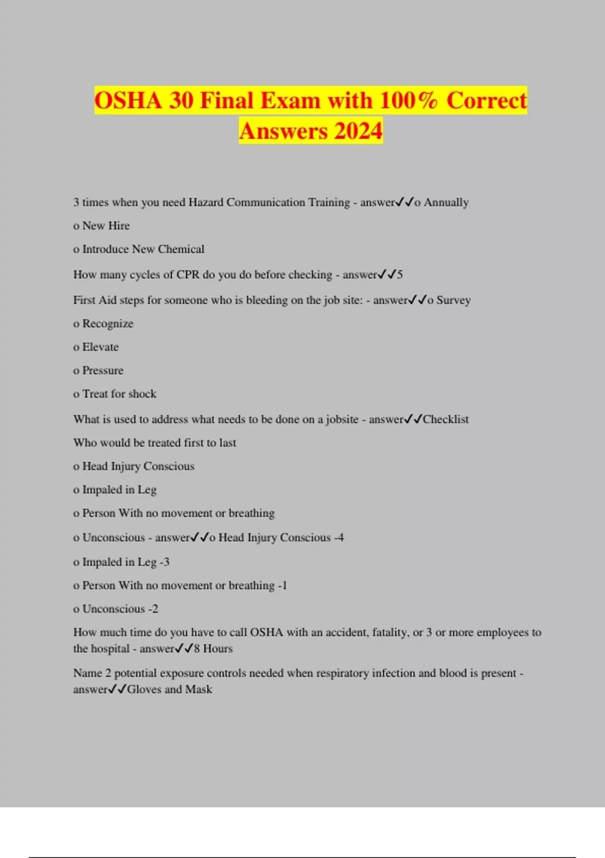 OSHA 30 Final Exam with 100% Correct Answers 2024 3 times when you need Hazard Communication Training - answero Annually o New Hire o Introduce New Chemical How many cycles of CPR do you do before checking - answer5 First Aid steps for someone who is bleeding on the job site: - answero Survey o Recognize o Elevate o Pressure o Treat for shock What is used to address what needs to be done on a jobsite - answerChecklist Who would be treated first to last o Head Injury Conscious o Impaled in Leg o Person With no movement or breathing o Unconscious - answero Head Injury Conscious -4 o Impaled in Leg -3 o Person With no movement or breathing -1 o Unconscious -2 How much time do you have to call OSHA with an accident, fatality, or 3 or more employees to the hospital - answer8 Hours Name 2 potential exposure controls needed when respiratory infection and blood is present - answerGloves and Mask What type of program does management implement that gives all employees value - answerBehavioral Based Program What is the minimum weight for a scaffold to support - answerThe scaffolds weight plus 4 times the maximum load What item is placed on a 300 Log, and through what dates must it be posted? - answero Recordable o Posted From Feb 1 to May 1 What height do you have to have railing on stairs - answer42 inches or 4th step What does the investigator need to find out - answerThe root cause What is an accident where no one is hurt - answerNear Miss What is the number of fire extinguishers needed on a 5 story building with 1000 sq ft floors - answer5