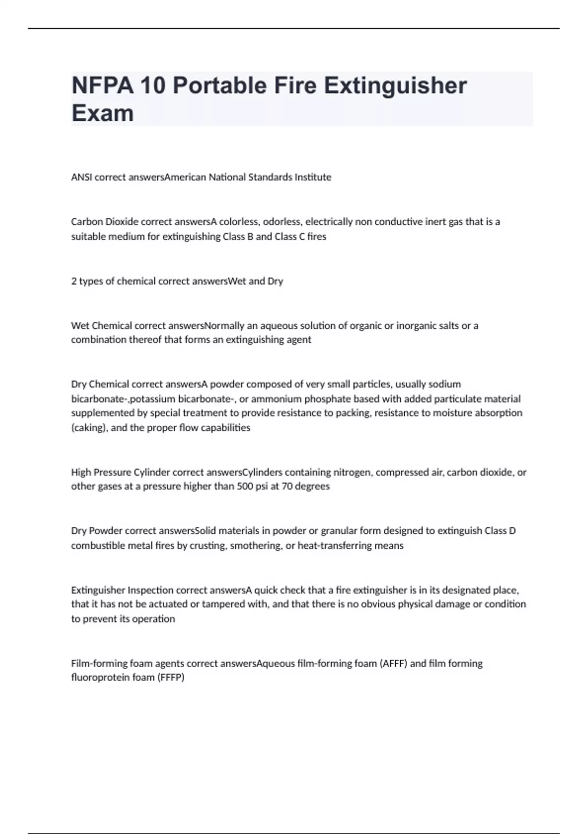 ANSI correct answersAmerican National Standards Institute Carbon Dioxide correct answersA colorless, odorless, electrically non conductive inert gas that is a suitable medium for extinguishing Class B and Class C fires 2 types of chemical correct answersWet and Dry Wet Chemical correct answersNormally an aqueous solution of organic or inorganic salts or a combination thereof that forms an extinguishing agent Dry Chemical correct answersA powder composed of very small particles, usually sodium bicarbonate-,potassium bicarbonate-, or ammonium phosphate based with added particulate material supplemented by special treatment to provide resistance to packing, resistance to moisture absorption (caking), and the proper flow capabilities High Pressure Cylinder correct answersCylinders containing nitrogen, compressed air, carbon dioxide, or other gases at a pressure higher than 500 psi at 70 degrees Dry Powder correct answersSolid materials in powder or granular form designed to extinguish Class D combustible metal fires by crusting, smothering, or heat-transferring means Extinguisher Inspection correct answersA quick check that a fire extinguisher is in its designated place, that it has not be actuated or tampered with, and that there is no obvious physical damage or condition to prevent its operation Film-forming foam agents correct answersAqueous film-forming foam (AFFF) and film forming fluoroprotein foam (FFFP)