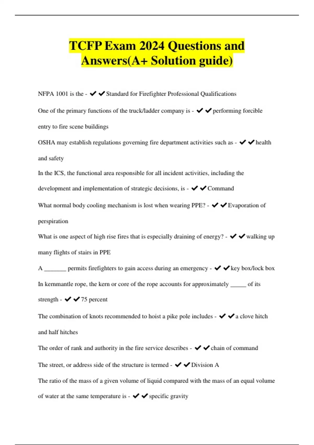 TCFP Exam 2024 Questions and Answers(A+ Solution guide) NFPA 1001 is the - ️️Standard for Firefighter Professional Qualifications One of the primary functions of the truck/ladder company is - ️️performing forcible entry to fire scene buildings OSHA may establish regulations governing fire department activities such as - ️️health and safety In the ICS, the functional area responsible for all incident activities, including the development and implementation of strategic decisions, is - ️️Command What normal body cooling mechanism is lost when wearing PPE? - ️️Evaporation of perspiration What is one aspect of high rise fires that is especially draining of energy? - ️️walking up many flights of stairs in PPE A _______ permits firefighters to gain access during an emergency - ️️key box/lock box In kernmantle rope, the kern or core of the rope accounts for approximately _____ of its strength - ️️75 percent The combination of knots recommended to hoist a pike pole includes - ️️a clove hitch and half hitches The order of rank and authority in the fire service describes - ️️chain of command The street, or address side of the structure is termed - ️️Division A