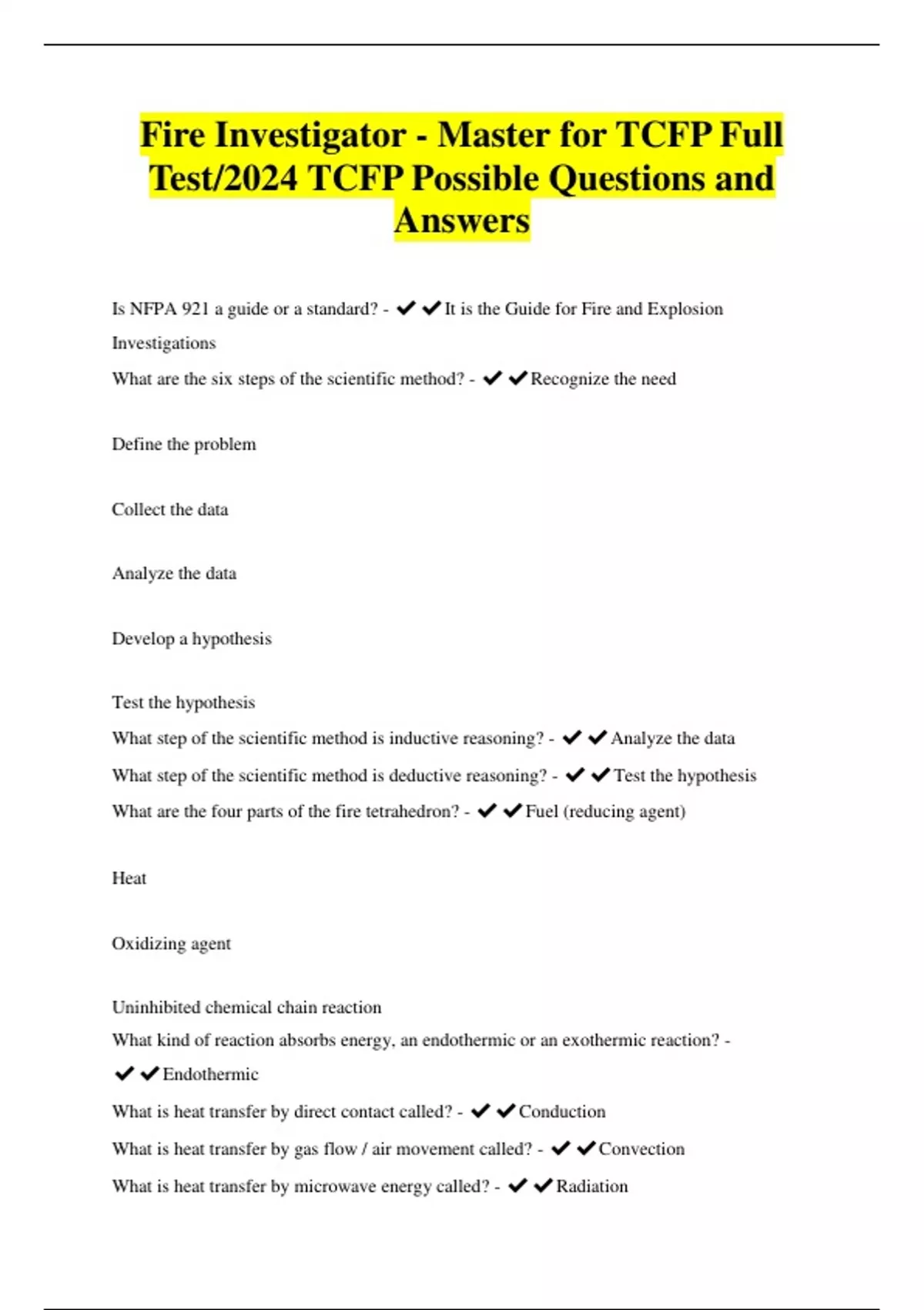 Fire Investigator - Master for TCFP Full Test/2024 TCFP Possible Questions and Answers Is NFPA 921 a guide or a standard? - ️️It is the Guide for Fire and Explosion Investigations What are the six steps of the scientific method? - ️️Recognize the need Define the problem Collect the data Analyze the data Develop a hypothesis Test the hypothesis What step of the scientific method is inductive reasoning? - ️️Analyze the data What step of the scientific method is deductive reasoning? - ️️Test the hypothesis What are the four parts of the fire tetrahedron? - ️️Fuel (reducing agent) Heat Oxidizing agent Uninhibited chemical chain reaction What kind of reaction absorbs energy, an endothermic or an exothermic reaction? - ️️Endothermic What is heat transfer by direct contact called? - ️️Conduction What is heat transfer by gas flow / air movement called? - ️️Convection What is heat transfer by microwave energy called? - ️️Radiation