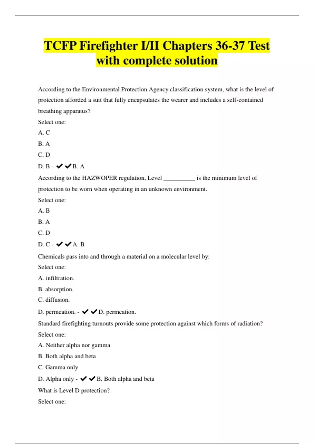 TCFP Firefighter I/II Chapters 36-37 Test with complete solution According to the Environmental Protection Agency classification system, what is the level of protection afforded a suit that fully encapsulates the wearer and includes a self-contained breathing apparatus? Select one: A. C B. A C. D D. B - ️️B. A According to the HAZWOPER regulation, Level __________ is the minimum level of protection to be worn when operating in an unknown environment. Select one: A. B B. A C. D D. C - ️️A. B Chemicals pass into and through a material on a molecular level by: Select one: A. infiltration. B. absorption. C. diffusion. D. permeation. - ️️D. permeation. Standard firefighting turnouts provide some protection against which forms of radiation? Select one: A. Neither alpha nor gamma B. Both alpha and beta C. Gamma only D. Alpha only - ️️B. Both alpha and beta What is Level D protection? Select one: