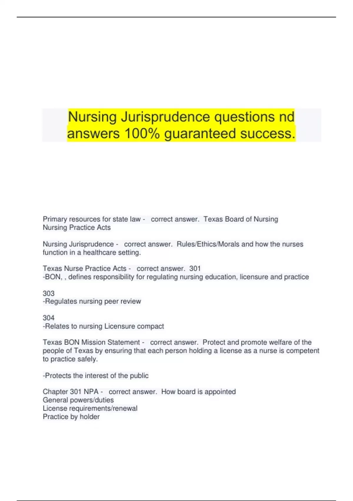 Nursing Jurisprudence questions and answers 100% guaranteed success. Primary resources for state law - correct answer. Texas Board of Nursing Nursing Practice Acts Nursing Jurisprudence - correct answer. Rules/Ethics/Morals and how the nurses function in a healthcare setting. Texas Nurse Practice Acts - correct answer. 301 -BON, , defines responsibility for regulating nursing education, licensure and practice 303 -Regulates nursing peer review 304 -Relates to nursing Licensure compact Texas BON Mission Statement - correct answer. Protect and promote welfare of the people of Texas by ensuring that each person holding a license as a nurse is competent to practice safely. -Protects the interest of the public Chapter 301 NPA - correct answer. How board is appointed General powers/duties License requirements/renewal Practice by holder Reporting violations and patient care concerns Prohibited practices/disciplinary actions Other penalties and enforcement previsions Anesthesia in outpatient settings Corrective action proceeding Board of Nursing - correct answer. Represent the people of Texas Can't lobby the legislature Does not regulate practice settings -Licensing -Enforcement Services -Audit of CE -Information Services Professional Associations - correct answer. Represent their members Do lobby legislature Efforts to improve work cond/benef for nurses -Job referral services -Legal Referral -Salary Q -Co-Worker Disputes -Employment issues Licensure and Regulation - correct answer. Temporary Permit -GN permit expires in 75 days -When pass/fail NCLEX Renew Online -60 days prior to expiration BON will send card Continuing Education -20 hours in 2 years -Fist time renewal exempt -CE hours in area of practice -Keep records for 4 years Initial Licensure by Examination - correct answer. Must submit criminal background check Submit a sworn application fee Verify completion of an approved nursing edu. Pass NCLEX Pass NJE with 75%>, NPA/BON rules, 50Q Disclosure of Criminal Behavior - correct answer. Must report any past criminal behavior or pending charges -Minor class C misdemeaners excluded (parking tickets, speeding tickets, jaywalking) Five Categories of Trust by BON - correct answer. Honesty Accountability Trustworthiness Reliability Integrity Good Professional Character - correct answer. Distinguish right from wrong Think and act rationally Keep promises and honor obligations Be accountable for own behavior Promptly disclose facts that could enhance health of pt. and protect from harm Professional Boundaries - correct answer. Must recognize/maintain professional boundaries -Do or say nothing that can't be documented Violations -Physical, Sexual, Emotional, Financial exploitation Nursing Peer Review - correct answer. Separate from BON review Confidential (incident based or Safe harbor) -Rule 217.19-PR and Whistleblower -Rule 217.20-SH PR and Whistle blower protections Incident Based Peer Review - correct answer. Any facility employing 10+ must have one Referral starts with error/incident PR without administrators Fact finding mission Eval. of paractice in atmosphere of collegiality Determine if incident merit or should be to BON RN Standards - correct answer. Make Nursing Dx Develop nursing care plan Eval. pt response to care Perform Comprehensive assessment Delegate tasks to UAP Practice independently w/in NPA board rules