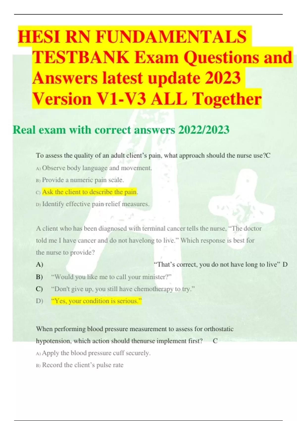 HESI RN FUNDAMENTALS TESTBANK Exam Questions and Answers latest update 2023 Version V1-V3 ALL Together Real exam with correct answers 2022/2023 To assess the quality of an adult client’s pain, what approach should the nurse use?C A) Observe body language and movement. B) Provide a numeric pain scale. C) Ask the client to describe the pain. D) Identify effective pain relief measures. A client who has been diagnosed with terminal cancer tells the nurse, “The doctor told me I have cancer and do not havelong to live.” Which response is best for the nurse to provide? A) “That’s correct, you do not have long to live” D B) “Would you like me to call your minister?” C) “Don't give up, you still have chemotherapy to try.” D) “Yes, your condition is serious.” When performing blood pressure measurement to assess for orthostatic hypotension, which action should thenurse implement first? C A) Apply the blood pressure cuff securely. B) Record the client’s pulse rate and rhythm. C) Position the client supine for a few minutes. D) Assist the client to stand at bedside. Female unlicensed assistive personnel (UAP) are assigned to take the vital signs of a client with pertussis for whom droplet precautions have been implemented. HESI RN FUNDAMENTALS TESTBANK Exam Questions and Answers latest update 2022/2023 HESI RN FUNDAMENTALS TESTBANK Exam Questions and Answers latest update 2019 Version V1-V3 ALL Together The UAP request a change in assignment, stating she has not yet been fitted for a particulate filter mask. What action should the nurse take? D When evaluating the effectiveness of a client’s nursing care, the nurse first reviews the expected outcomes identified in the plan of care. What action should the nurse take next? A) Modify the nursing interventions to achieve the client’s goals. B) Determine if the expected outcomes were realistic. C) Review related professional standards of care. D) Obtain current client data to compare with expected outcomes. A policy requiring the removal of acrylic nails by all nursing personnel was implemented six months ago. Which assessment measure best determines if the intended outcome of the policy is being achieved? A) Number of the staff-induced skin injuries. B)Client satisfaction survey. C) Rate of needlestick injuries by nurses. D) Healthcare-associated infection rates. A client with limited tolerance for activity needs to walk in the hallway with assistance. Which instructions should the nurse give to the unlicensed assistive personnel (UAP) who assisting with client’s care? (Select all that apply.) HESI RN FUNDAMENTALS TESTBANK Exam Questions and Answers latest update 2022/2023 HESI RN FUNDAMENTALS TESTBANK Exam Questions and Answers latest update 2019 Version V1-V3 ALL Together A) Instruct the client about signs of orthostatic hypertension B) Determine if the client needs to have a gait belt applied C) Measure the clients vital signs before the client walks. D) Offer to assist the client to void prior to walking in the hall. E) Report the onset of any dizziness or light headedness. A client has begun a long-term maintenance therapy with lithium, which has a narrow therapeutic index. Which adverse effect is most important for nurse to include in the teaching plan? A) Dependence. B) Toxicity. C) Interaction. D) Tolerance. While interviewing a client, the nurse records the assessment in the electronic health record. Which statement is most accurate regarding electronic documentation during an interview? A) The interview process is enhanced with electronic documentation and allows the client to speak at a normal pace. B) Completing the electronic record during an interview is a legal obligation of the examining HESI RN FUNDAMENTALS TESTBANK Exam Questions and Answers latest update 2022/202