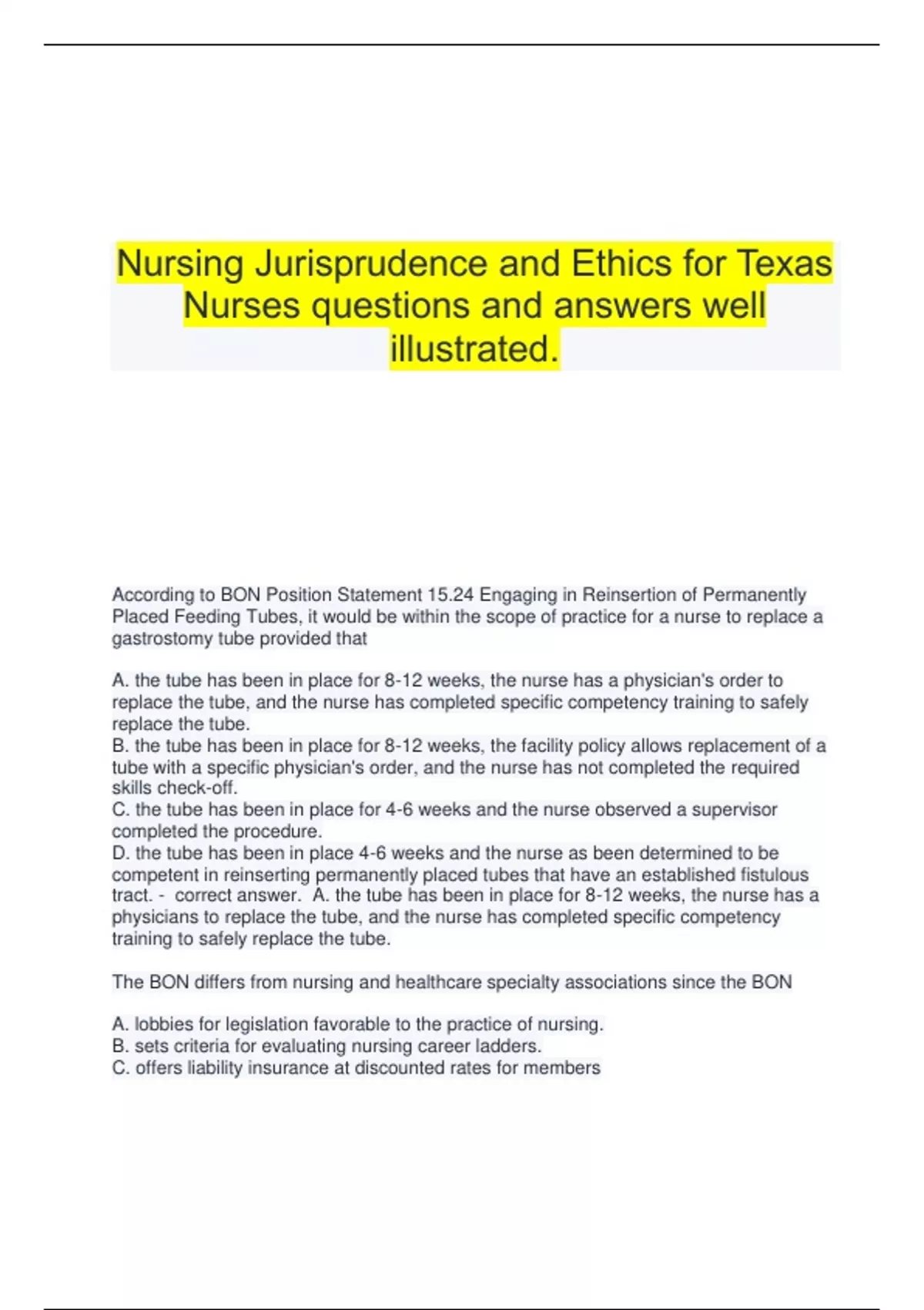 Nursing Jurisprudence and Ethics for Texas Nurses questions and answers well illustrated. According to BON Position Statement 15.24 Engaging in Reinsertion of Permanently Placed Feeding Tubes, it would be within the scope of practice for a nurse to replace a gastrostomy tube provided that A. the tube has been in place for 8-12 weeks, the nurse has a physician's order to replace the tube, and the nurse has completed specific competency training to safely replace the tube. B. the tube has been in place for 8-12 weeks, the facility policy allows replacement of a tube with a specific physician's order, and the nurse has not completed the required skills check-off. C. the tube has been in place for 4-6 weeks and the nurse observed a supervisor completed the procedure. D. the tube has been in place 4-6 weeks and the nurse as been determined to be competent in reinserting permanently placed tubes that have an established fistulous tract. - correct answer. A. the tube has been in place for 8-12 weeks, the nurse has a physicians to replace the tube, and the nurse has completed specific competency training to safely replace the tube. The BON differs from nursing and healthcare specialty associations since the BON A. lobbies for legislation favorable to the practice of nursing. B. sets criteria for evaluating nursing career ladders. C. offers liability insurance at discounted rates for members D. protects and promotes the welfare of the people of Texas - correct answer. D. protects and promotes the welfare of the people of Texas. The Standards of Nursing Practice, Board Rule 217.11 state that the LVN scope of practice includes including doing which of the following with regard to care plans? A. Initiate the development of a comprehensive nursing care plan independently B. May not document on the nursing care plan C. Participate in the modification and development of the nursing care plan. D. Review the nursing care plan only if directed to do so by the physician. - correct answer. C. Participate in the modification and development of the nursing care plan. A nurse who contacts a physician to clarify a medication order is A. fulfilling a duty to keep the patient safe. B. likely to detract from a collegial nurse-physician relationship. C. engaging in action that is the duty of the pharmacist. D. not fulfilling nursing tasks with other patients. - correct answer. A. fulfilling a duty to keep the patient safe. Nurses often ask the Board about what it means to abandon their patients. Though the Board does not use this term in the rules, what specific portion of Board Rule 217.12, Unprofessional Conduct, provides directions for the nurse regarding job abandonment and conduct that may also be Board-reportable? A. Paragraph (5) B. Paragraph (7) C. Paragraph (12) D. Paragraph (8) - correct answer. C. Paragraph (12) Which of the following situations is an example of a nurse MAINTAINING appropriate professional boundaries between the nurse and the client? A nurse A. rewards a patient with a small stuffed mascot of his favorite football team for progress made in rehabilitation. B. responds less frequently to a demanding patient's call light. C. shares personal information regarding her recent bankruptcy because the patient seems genuinely interested. D. is personally attracted to a patient and calls and visits him on her days off "to check on how he is doing." - correct answer. A. rewards a patient with a small stuffed mascot of his favorite football team for progress made in rehabilitation. Am advertisement for a "licensed nurse" states the following as routine job responsibilities. "Must work independently without supervision, have expertise in developing nursing care plans, including establishing appropriate nursing diagnoses for assigned patients, and, must be able to complete comprehensive nursing assessments." Based on these responsibilities, this advertisement would require, at a minimum, the nurse to hold a valid A. Advanced Practice Registered Nurse license. B. Physician Assistant license. C. Vocational Nurse license. D. Registered Nurse license. - correct answer. D. Registered Nurse license. A nurse is caught stealing narcotics from the automated dispensing machine on the unit and self-injecting these drugs while on duty. The nurse admits that she is chemically dependent. In this situation, the NPA requires A. the nurse be reported to the BON. B. the Peer Review Committee to monitor the nurse's practice. C. the nurse to enroll in the Texas Peer Assistance Program for Nurses (TPAPN). D. a report to law enforcement. - correct answer. B. the Peer Review Committee to monitor the nurse's practice. A nurse was reported to the BON by two different employers multiple practice errors. The BON may determine that the nurse's conduct demonstrates a pattern of practice that A. complies with the standard to provide nursing services without discrimination of the client served. B. violates professional boundary regulations because the nurse has two employers C. results in immediate disciplinary action because the second complain validates the first. D. indicates the nurse's continued practice poses a risk of harm and may endanger a client's life, health, or safety. - correct answer. D. indicates the nurse's continued practice poses a risk of harm and may endanger a client's life, health, or safety. According to Board Rule 213.29, Criteria and Procedure Regarding Intemperate Use and Lack of Fitness in Eligibility and Disciplinary Matters, a person desiring to obtain or retain his or her nursing license must provide a sworn certificate to the board that he or she has NOT A. had any alcohol within the last five years. B. been under the influence of any alcohol or other illegal substance for the last five years. C. been addicted to or treated for the use of alcohol or any other drug in the last five years. D. been in the hospital for any type of surgery within the last five years. - correct answer. B. been under the inf