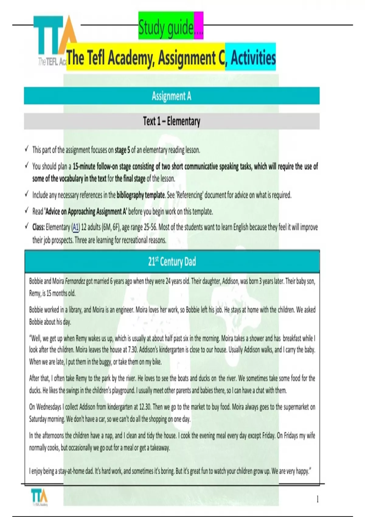 Study guide…. The Tefl Academy, Assignment C, Activities Assignment A Text 1 – Elementary This part of the assignment focuses on stage 5 of an elementary reading lesson. You should plan a 15-minute follow-on stage consisting of two short communicative speaking tasks, which will require the use of some of the vocabulary in the text for the final stage of the lesson. Include any necessary references in the bibliography template. See 'Referencing' document for advice on what is required. Read 'Advice on Approaching Assignment A' before you begin work on this template. Class: Elementary (A1) 12 adults (6M, 6F), age range 25-56. Most of the students want to learn English because they feel it will improve their job prospects. Three are learning for recreational reasons.