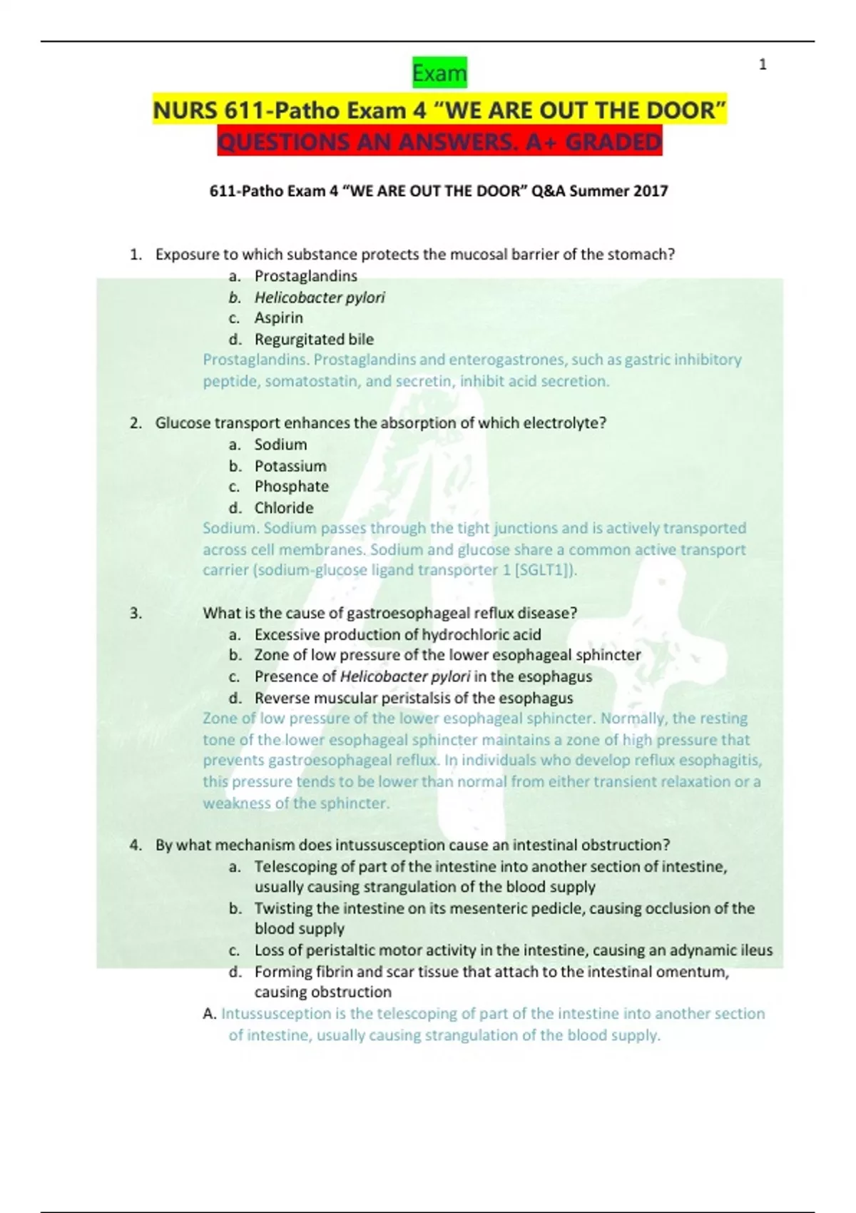Exam NURS 611-Patho Exam 4 “WE ARE OUT THE DOOR” QUESTIONS AN ANSWERS. A+ GRADED 611-Patho Exam 4 “WE ARE OUT THE DOOR” Q&A Summer 2017 1. Exposure to which substance protects the mucosal barrier of the stomach? a. Prostaglandins b. Helicobacter pylori c. Aspirin d. Regurgitated bile Prostaglandins. Prostaglandins and enterogastrones,such as gastric inhibitory peptide, somatostatin, and secretin, inhibit acid secretion. 2. Glucose transport enhances the absorption of which electrolyte? a. Sodium b. Potassium c. Phosphate d. Chloride Sodium. Sodium passes through the tight junctions and is actively transported across cell membranes. Sodium and glucose share a common active transport carrier (sodium-glucose ligand transporter 1 [SGLT1]). 3. What isthe cause of gastroesophageal reflux disease? a. Excessive production of hydrochloric acid b. Zone of low pressure of the lower esophageal sphincter c. Presence of Helicobacter pylori in the esophagus d. Reverse muscular peristalsis of the esophagus Zone of low pressure of the lower esophageal sphincter. Normally, the resting tone of the lower esophageal sphincter maintains a zone of high pressure that prevents gastroesophageal reflux. In individuals who develop reflux esophagitis, this pressure tends to be lower than normal from either transient relaxation or a weakness of the sphincter. 4. By what mechanism does intussusception cause an intestinal obstruction? a. Telescoping of part of the intestine into anothersection of intestine, usually causing strangulation of the blood supply b. Twisting the intestine on its mesenteric pedicle, causing occlusion of the blood supply c. Loss of peristaltic motor activity in the intestine, causing an adynamic ileus d. Forming fibrin and scar tissue that attach to the intestinal omentum, causing obstruction A. Intussusception is the telescoping of part of the intestine into another section of intestine, usually causing strangulation of the blood supply. 2 Exam NURS 611-Patho Exam 4 “WE ARE OUT THE DOOR” QUESTIONS AN ANSWERS. A+ GRADED 5. What isthe most immediate result of a small intestinal obstruction? a. Vomiting b. Electrolyte imbalances c. Dehydration d. Distention Distention begins almost immediately, as gases and fluids accumulate proximal to the obstruction. Within 24 hours, up to 8 L of fluid and electrolytes enters the lumen in the form of saliva, gastric juice, bile, pancreatic juice, and intestinal secretions. Copious vomiting or sequestration of fluids in the intestinal lumen preventstheir reabsorption and produces severe fluid and electrolyte disturbances. 6. An intestinal obstruction at the pylorus or high in the small intestine causes metabolic alkalosis by causing which outcome? a. Gain of bicarbonate from pancreatic secretions that cannot be absorbed b. Excessive loss of hydrogen ions normally absorbed from gastric juices c. Excessive loss of potassium, promoting atony of the intestinal wall d. Loss of bile acid secretions that cannot be absorbed Excessive loss of hydrogen ions. If the obstruction is at the pylorus or high in the small intestine, then metabolic alkalosis initially develops as a result of excessive loss of hydrogen ionsthat normally would be reabsorbed from the gastric juices. 7. What are the cardinal symptoms ofsmall intestinal obstruction? a. Constant, dull pain in the lower abdomen relieved by defecation b. Acute, intermittent pain 30 minutesto 2 hours after eating c. Colicky pain caused by distention, followed by vomiting d. Excruciating pain in the hypogastric area caused by ischemia Colicky pain caused by distention followed by vomiting. 8. What is the primary cause of peptic ulcers? a. Hypersecretion of gastric acid b. Helicobacter pylori c. Hyposecretion of pepsin d. Escherichia coli Helicobacter pylori. 9. A peptic ulcer may occur in all of the following areas except the: a. Stomach b. Jejunum c. Duodenum d. Esophagus Jejunum 3 Exam NURS 611-Patho Exam 4 “WE ARE OUT THE DOOR” QUESTIONS AN ANSWERS. A+ GRADED 10. After a partial gastrectomy or pyloroplasty, clinical manifestationsthat include increased pulse, hypotension, weakness, pallor, sweating, and dizziness are the results of which mechanism? a. Anaphylactic reaction in which chemical mediators, such as histamine, prostaglandins, and leukotrienes, relax vascularsmooth muscles, causing shock. b. Postoperative hemorrhage during which a large volume of blood is lost, causing hypotension with compensatory tachycardia. c. Concentrated bolusthat moves from the stomach into the small intestine, causing hyperglycemia and resulting in polyuria and eventually hypovolemic shock. d. Rapid gastric emptying and the creation of a high osmotic gradient in the small intestine, causing a sudden shift of fluid from the blood vessels to the intestinal lumen. D. Dumping syndrome occurs with varying severity in 5% to 10% of individuals who have undergone partial gastrectomy or pyloroplasty. Rapid gastric emptying and the creation of a high osmotic gradient in the small intestine cause a sudden shift of fluid from the vascular compartment to the intestinal lumen. Plasma volume decreases, causing vasomotor responses, such as increased pulse rate, hypotension, weakness, pallor, sweating, and dizziness. Rapid distention of the intestine produces a feeling of epigastric fullness, cramping, nausea, vomiting, and diarrhea 11. Which statement is consistent with dumping syndrome? a. Dumping syndrome usually responds well to dietary management. b. It occurs 1 to 2 hours after eating. c. Constipation is often a result of the dumping syndrome. d. It can result in alkaline reflux gastritis. Usually responds well to dietary management. 12. Which statement is false regarding the sources of increased ammonia that contribute to hepatic encephalopathy? a. End products of intestinal protein digestion are sources of increased ammonia. b. Digested blood leaking from ruptured varices is a source of increased ammonia. c. Accumulation ofshort