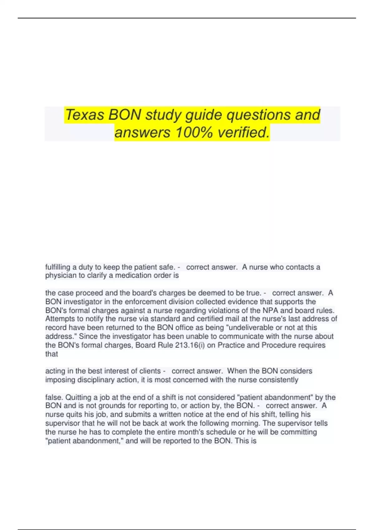 Texas BON study guide questions and answers 100% verified. fulfilling a duty to keep the patient safe. - correct answer. A nurse who contacts a physician to clarify a medication order is the case proceed and the board's charges be deemed to be true. - correct answer. A BON investigator in the enforcement division collected evidence that supports the BON's formal charges against a nurse regarding violations of the NPA and board rules. Attempts to notify the nurse via standard and certified mail at the nurse's last address of record have been returned to the BON office as being "undeliverable or not at this address." Since the investigator has been unable to communicate with the nurse about the BON's formal charges, Board Rule 213.16(i) on Practice and Procedure requires that acting in the best interest of clients - correct answer. When the BON considers imposing disciplinary action, it is most concerned with the nurse consistently false. Quitting a job at the end of a shift is not considered "patient abandonment" by the BON and is not grounds for reporting to, or action by, the BON. - correct answer. A nurse quits his job, and submits a written notice at the end of his shift, telling his supervisor that he will not be back at work the following morning. The supervisor tells the nurse he has to complete the entire month's schedule or he will be committing "patient abandonment," and will be reported to the BON. This is the applicant provides satisfactory evidence that he/she has not committed a violation of the Nursing Practice Act or a Board rule - correct answer. Which of the following would indicate that an applicant for licensure is likely to possess the good professional character necessary to hold a nursing license in Texas? Safe Harbor must be invoked prior to engaging in the assignment or at any time the assignment changes as long as the nurse believes it places patients at risk of harm - correct answer. Which of the following statements correctly reflects Board Rule 217.20 regarding the Safe Harbor Peer Review? throughout the entire investigation process - correct answer. The identity of a person submitting a complaint against a nurse to the BON is kept confidential the nurse must be authorized by the BON as an advanced practice registered nurse with prescriptive authority in a role and population focus appropriate for the patients being treated - correct answer. A nurse assesses a patient, makes a medical diagnosis of "hypertension," and determines which specific anti-hypertensive medication (including dose, route, and frequency) is appropriate for this patient. The nurse then writes a prescription for an anti-hypertensive medication and instructs the patient to have it filled at a pharmacy of her choice. bills passed by the Texas Legislature - correct answer. Revisions to the NPA can only occur through the LVN must have a registered nurse present at all times while they are providing direct patient care - correct answer. The Position Statement 15.27 The Licensed Vocational Nurse Scope of Practice on the board's website outlines that LVNs have a "directed" scope of practice "under supervision." This means that a violation of professional boundaries of the nurse-client relationship - correct answer. A nurse providing nursing services to a young child in a home setting asks the parent to bring the child to the nurse's home for nursing care. The nurse asks the parent to keep this arrangement confidential. This could be considered Position Statement 15.14 Duty of a Nurse in Any Setting - correct answer. A nurse is counseled for questioning a physician's order that made the physician mad. Which of the following documents on the BON web site best explains why the nurse was correct to question a physician's order that the nurse believed could be harmful to a patient? the nurse must be reported to the BON because of the combination of practice errors with possible practice impairment due to substance use or abuse - correct answer. Chart audits find the following practice errors committed by a nurse with observed impaired behavior at work: NO physician orders for narcotics signed out by the nurse, and NO documentation that the nurse either administered or wasted the narcotics. The best decision for the Incident Based Peer Review Committee to make is that recognizes that a patient's condition is deteriorating, acts to stabilize the patient, and reports the patient's status to the physician - correct answer. A nurse would be fulfilling his or her duty to safeguard patients from harm if the nurse current sobriety and fitness to practice - correct answer. A person with a history of chemical dependency on controlled substances who desires to obtain or retain a license to practice nursing may be required to provide evidence of protections for a nurse who requests a peer review determination - correct answer. A nurse may not be reported to the BON, may not have his or her license sanctioned by the BON, and may not be suspended or terminated from his or her employment for either appropriately invoking Safe Harbor or for advising another nurse of their right to invoke Safe Harbor. These are ensuring that each nurse is competent to practice safely - correct answer. One way the board carries out its mission to protect the public is by rewards a patient with a small stuffed mascot of his favorite football team for progress made in rehabilitation - correct answer. Which of the following situations is an example of a nurse MAINTAINING appropriate professional boundaries between the nurse and the client? A nurse the tube has been in place for 8-12 weeks, the nurse has a physician's order to replace the tube, and the nurse has completed specific competency training to safely replace the tube - correct answer. According to BON Position Statement 15.24 Nurses Engaging in Reinsertion of Permanently Placed Feeding Tubes, it would be within the scope of practice for a nurse to replace a gastrostomy tube provid