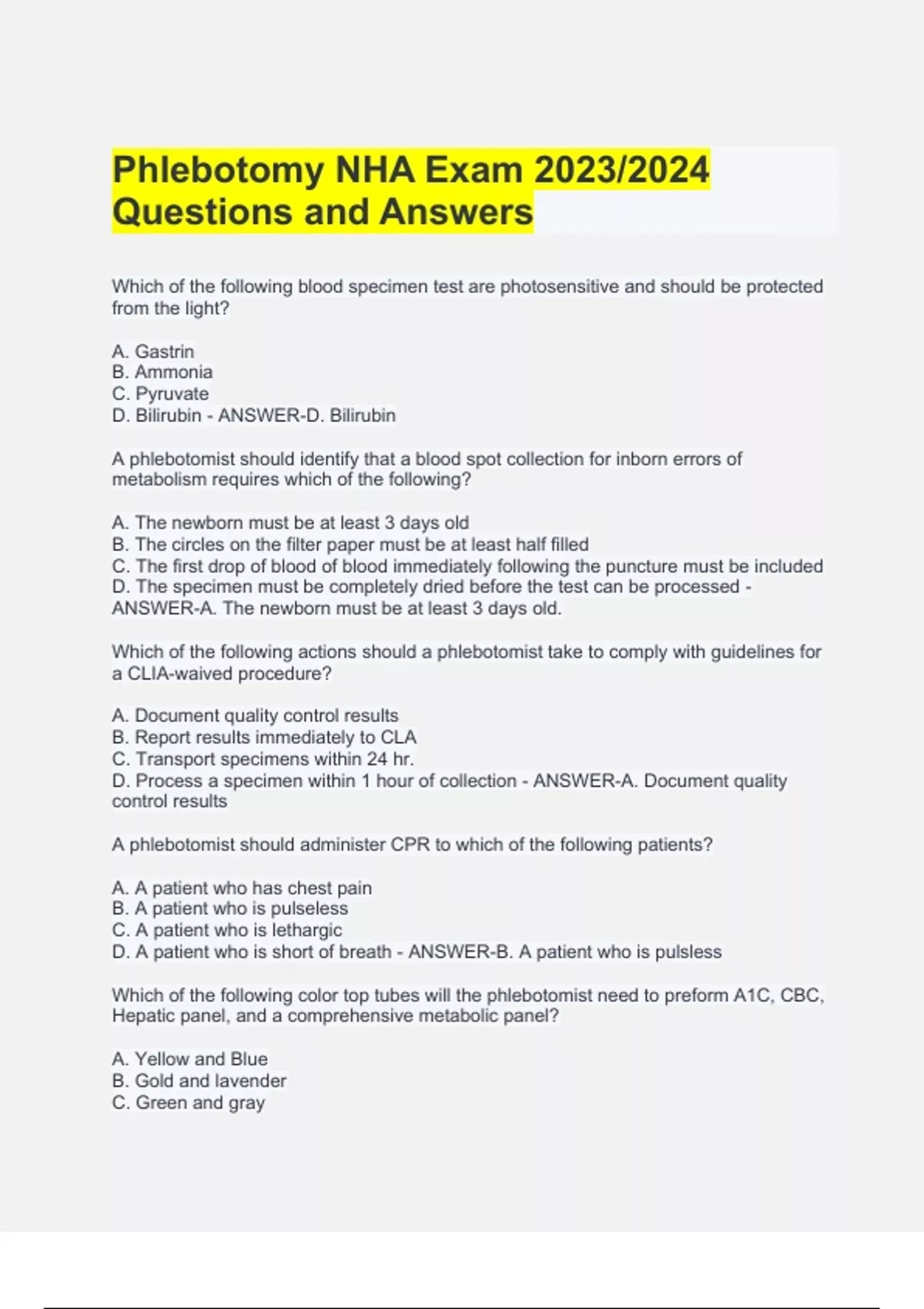 This document provides the full Phlebotomy NHA (National Healthcareer Association) Exam with verified correct answers. It covers all major topics tested on the NHA Certified Phlebotomy Technician (CPT) exam, including specimen collection, venipuncture techniques, safety and infection control, order of draw, anatomy and physiology, and laboratory procedures. Ideal for students and professionals preparing for NHA certification, offering accurate and comprehensive practice material. Phlebotomy NHA Exam 2023/2024 Questions and Answers Phlebotomy NHA Exam 2023/2024 Questions and Answers Phlebotomy NHA Exam 2023/2024 Questions and Answers Phlebotomy NHA Exam 2023/2024 Questions and Answers Phlebotomy NHA Exam 2023/2024 Questions and Answers Phlebotomy NHA Exam 2023/2024 Questions and Answers Phlebotomy NHA Exam 2023/2024 Questions and Answers Phlebotomy NHA Exam 2023/2024 Questions and Answers Phlebotomy NHA Exam 2023/2024 Questions and Answers Phlebotomy NHA Exam 2023/2024 Questions and Answers Phlebotomy NHA Exam 2023/2024 Questions and Answers Phlebotomy NHA Exam 2023/2024 Questions and Answers Phlebotomy NHA Exam 2023/2024 Questions and Answers Phlebotomy NHA Exam 2023/2024 Questions and Answers Phlebotomy NHA Exam 2023/2024 Questions and Answers Phlebotomy NHA Exam 2023/2024 Questions and Answers Phlebotomy NHA Exam 2023/2024 Questions and Answers Phlebotomy NHA Exam 2023/2024 Questions and Answers Phlebotomy NHA Exam 2023/2024 Questions and Answers Phlebotomy NHA Exam 2023/2024 Questions and Answers Phlebotomy NHA Exam 2023/2024 Questions and Answers Phlebotomy NHA Exam 2023/2024 Questions and Answers Phlebotomy NHA Exam 2023/2024 Questions and Answers Phlebotomy NHA Exam 2023/2024 Questions and Answers Phlebotomy NHA Exam 2023/2024 Questions and Answers Phlebotomy NHA Exam 2023/2024 Questions and Answers Phlebotomy NHA Exam 2023/2024 Questions and Answers Phlebotomy NHA Exam 2023/2024 Questions and Answers Phlebotomy NHA Exam 2023/2024 Questions and Answers Phlebotomy NHA Exam 2023/2024 Questions and Answers Phlebotomy NHA Exam 2023/2024 Questions and Answers Phlebotomy NHA Exam 2023/2024 Questions and Answers Phlebotomy NHA Exam 2023/2024 Questions and Answers Phlebotomy NHA Exam 2023/2024 Questions and Answers