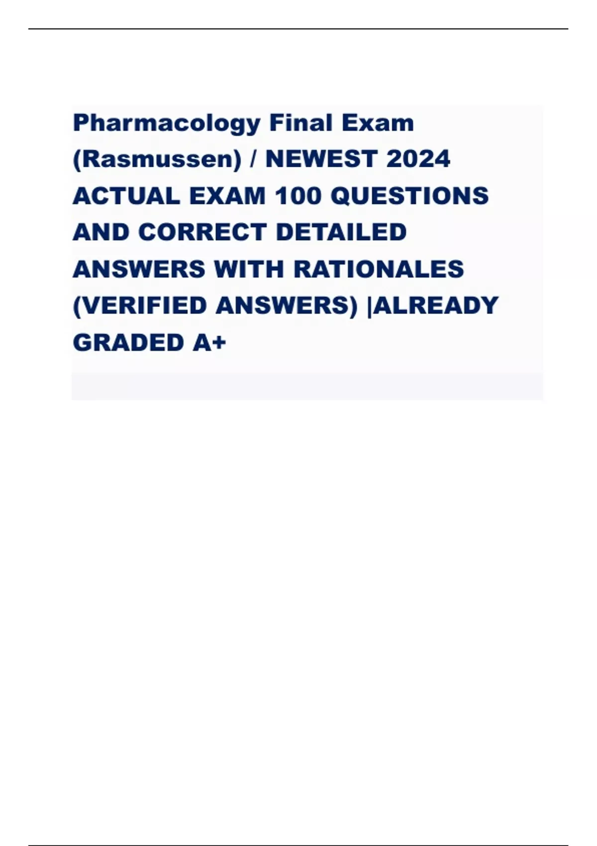 ATI Pharmacology Proctor 2019 Study Guide NEWEST 2024 ACTUAL EXAM QUESTIONS AND CORRECT DETAILED ANSWERS WITH RATIONALES VERIFIED ANSWERS ALREADY GRADED A+ A nurse is preparing to administer heparin 900 units/hr. via IV infusion. The amount available is heparin 25, 000 units in 500 mL 5% dextrose in water. The nurse should set the IV pump to deliver how many mL/hr? (Round to the nearest whole number) - CORRECT ANSWER-18 mL/hr A nurse is preparing to administer oxytocin to a client who is at 41 weeks of gestation and is experiencing ineffective labor. Which of the following actions should the nurse plan to take? A. place oxytocin from a pre-filled syringe into the posterior fornix of the vagina every 10 min until effective labor occurs B. check the client's bp and pulse every 15 min while induction of labor is occurring C. stop oxytocin for contractions that continue longer than 30 min D. increase the dose of oxytocin to obtain uterine contractions that occur every 2 to 3 min - CORRECT ANSWER-D. increase the dose of oxytocin to obtain uterine contractions that occur every 2 to 3 min Effective uterine contractions should occur every 2 to 3 min. A nurse is assessing a client who reports using several herbal and vitamin supplements daily, including saw palmetto. The nurse should recognize that saw palmetto is a supplement used by clients to elicit which of the following therapeutic effects A. urinary health promotion B. immune system stimulation C. decreased leg pain from arterial disease D. prevention of nausea caused by motion sickness - CORRECT ANSWER-A. urinary health promotion Saw palmetto is used primarily for manifestations related to prostatic conditions, such as benign prostatic hypertrophy (BPH). Its effectiveness has not been scientifically proven, however. The nurse should teach the client to check with the provider about interactions between saw palmetto and other medications. A nurse is providing teaching to a group of new parents about medications. The nurse should include that aspirin is contraindicated for children who have a viral infection due to the risk of developing which of the following adverse effects? a. Reye's syndrome b. Visual disturbances c. Diabetes mellitus d. Wilm's tumor - CORRECT ANSWER-a. Reye's syndrome A nurse is providing teaching to a client who has chronic kidney failure with an AV fistula for hemodialysis and new prescription for epoetin alfa. Which of the following therapeutic effects of epoetin alfa should the nurse include in the teaching? a. Reduces blood pressure b. Inhibits clotting of fistula c. Promotes RBC production d. Stimulates growth of neutrophils - CORRECT ANSWER-c. Promotes RBC production