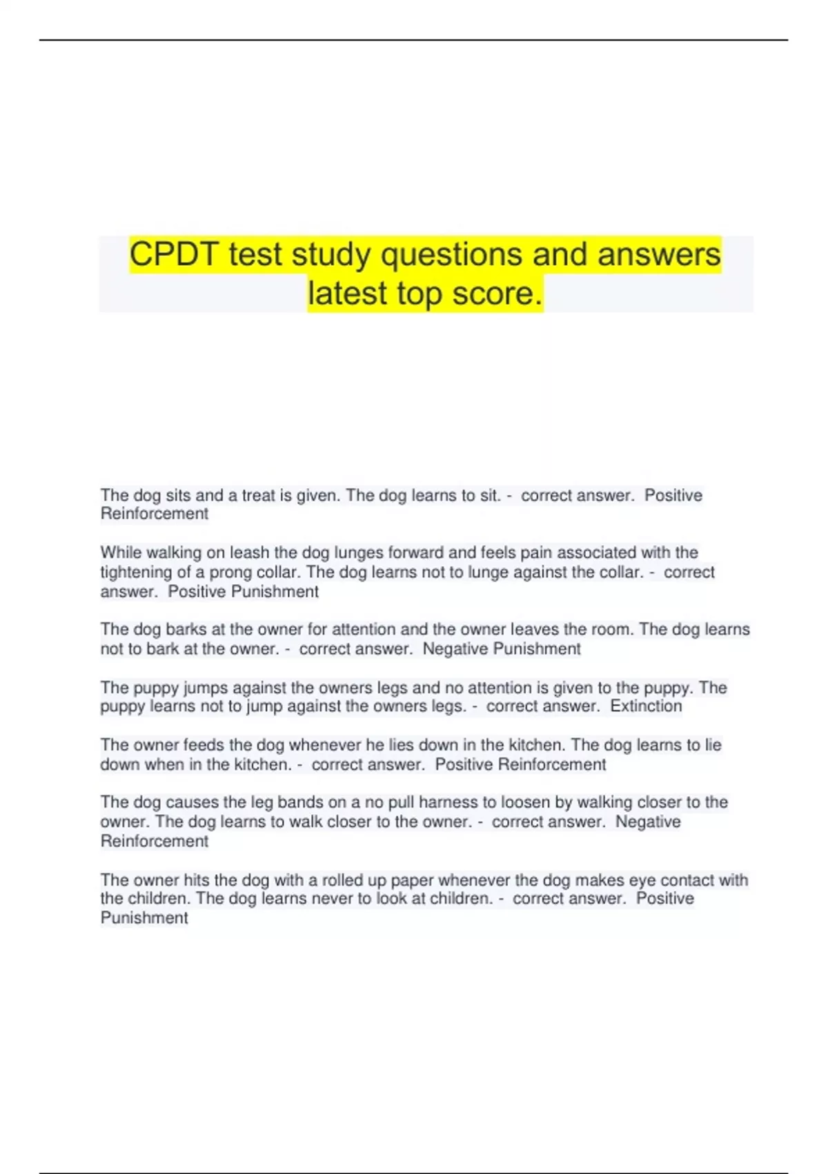 CPDT test study questions and answers latest top score. The dog sits and a treat is given. The dog learns to sit. - correct answer. Positive Reinforcement While walking on leash the dog lunges forward and feels pain associated with the tightening of a prong collar. The dog learns not to lunge against the collar. - correct answer. Positive Punishment The dog barks at the owner for attention and the owner leaves the room. The dog learns not to bark at the owner. - correct answer. Negative Punishment The puppy jumps against the owners legs and no attention is given to the puppy. The puppy learns not to jump against the owners legs. - correct answer. Extinction The owner feeds the dog whenever he lies down in the kitchen. The dog learns to lie down when in the kitchen. - correct answer. Positive Reinforcement The dog causes the leg bands on a no pull harness to loosen by walking closer to the owner. The dog learns to walk closer to the owner. - correct answer. Negative Reinforcement The owner hits the dog with a rolled up paper whenever the dog makes eye contact with the children. The dog learns never to look at children. - correct answer. Positive Punishment The dog barks in his crate for 20 to 30 minutes after the owner leaves. Nothing happens as a result of the barking. The dog learns not to bark when the owner leaves. - correct answer. Extinction The dog looks away from the handler during the heel free exercise and the handler abandons the dog in the training room. The dog learns to keep his eyes glued on the handler. - correct answer. Negative Punishment A puppy is tethered to a training wall. The handler walks away from the puppy whenever he is jumping. The do learns to keep four feet on the floor when standing by the handler. - correct answer. Negative Punishment Treats are dropped on the floor in the kitchen whenever the dog stares at the cook. The dog learns to stare at anyone who is cooking. - correct answer. Positive Reinforcement A dog, while chasing a deer is called. When he does not return to his handler, an electric shock is applied to his neck. The dog learns to come back when called. - correct answer. Positive Punishment While learning to retrieve, a lab opens his mouth and an ear pinch stops when he opens his mouth to take the dummy. The dog learns to open his mouth to accept the dummy. - correct answer. Negative Reinforcement The puppy jumps on the garbage can and knocks it over, and edible refuse is dumped out on the floor. The puppy learns to get into garbage cans. - correct answer. Positive Reinforcement The puppy jumps on the garbage can and knocks it over, and a large pile of cans falls on the puppy causing extreme fear. The puppy stops jumping on the garbage can. - correct answer. Positive Punishment The puppy follows children home everyday in hope of attention. The children fail to pay attention to the pup ans he eventually stops following them. - correct answer. Extinction A fearful pup barks at approaching people who then back off. Barking increases. - correct answer. Negative Reinforcement On the agility course the dog running begins to bark. The handler removes the dog from the course and puts him in his crate. The dog learns to run quietly. - correct answer. Negative Punishment A service dog is given a treat when he applies forward pressure on his harness. The dog learns to lead his partner. - correct answer. Positive Reinforcement A veterinary technician feeds the dog a treat when he is being examined by the vet. The dog learns to enjoy visiting the vet. - correct answer. Positive Reinforcement When training a dog to go over the A frame in agility, the trainer offers a treat to the dog when he has his back feet on the contact zone and his front feet on the ground. The dog learns to go all the way to the ground and touch the contact zone along the way. - correct answer. Positive Reinforcement In practice sessions, the handler uses a prong collar and a tight leash to keep the dog at her side. The dog learns to heel close to the handler to release the presser on the prong collar. - correct answer. Negative Reinforcement In the protection phase of Schutzhund training a puppy is allowed to take the sleeve off the arm of the agitator. The puppy learns to bite when being formally agitated. - correct answer. Positive Reinforcement At the groomer's , the dog barks while in the drying crate. The groomer uses a squirt bottle to spray water in his face to "correct" the barking. The dog learns to avoid going into any crate. - correct answer. Positive Punishment Every morning you take your puppy to the dog play park. You approach from the south end of the park and meet your other dog walking friends. One morning you are in a rush and need to drive to the dog park in order to get your walk done. You park at the North end of the park and your puppy runs straight to the South end of the park to meet his playmates. What type of learning is happening? A. Applied Learning B. Latent Learning C. Motivated Learning D. Cognitive Learning E. All of the above - correct answer. B. Latent Learning Indicate which statement is false: A. The trainer will know that learning has occurred when behavior changes. B. The trainer will know that learning has occurred when the dog begins to defer to the owner. C. The trainer will know that learning has occurred when the dog responds to the owner's cues. D. None of the above. E. All of the above. - correct answer. B. The trainer will know that learning has occurred when the dog begins to defer to the owner. The desire to do a behavior may be contingent upon what the dog gets from doing that behavior. If the dog is sufficiently motivated by the reward, he will be likely to do the requested behavior.. If a dog is hungry what is he most likely to be motivated by? A. A ball B. The chance to chase another dog C. Touch D. A belly rub E. Food - correct answer. E. Food What are the four stages of learning? A. Acquisition, fluency, generalization, maintenance