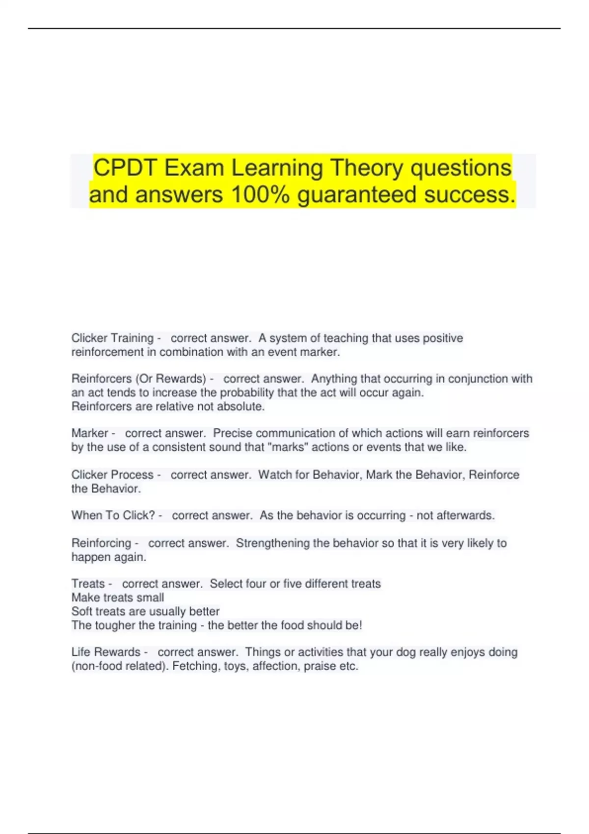 CPDT Exam Learning Theory questions and answers 100% guaranteed success. Clicker Training - correct answer. A system of teaching that uses positive reinforcement in combination with an event marker. Reinforcers (Or Rewards) - correct answer. Anything that occurring in conjunction with an act tends to increase the probability that the act will occur again. Reinforcers are relative not absolute. Marker - correct answer. Precise communication of which actions will earn reinforcers by the use of a consistent sound that "marks" actions or events that we like. Clicker Process - correct answer. Watch for Behavior, Mark the Behavior, Reinforce the Behavior. When To Click? - correct answer. As the behavior is occurring - not afterwards. Reinforcing - correct answer. Strengthening the behavior so that it is very likely to happen again. Treats - correct answer. Select four or five different treats Make treats small Soft treats are usually better The tougher the training - the better the food should be! Life Rewards - correct answer. Things or activities that your dog really enjoys doing (non-food related). Fetching, toys, affection, praise etc. Clicker - correct answer. An event marker to indicate the moment in time the desired behavior happens. Note: Studies have shown that the clicker is more effective and accurate than voice markers are. What Makes A Good Event Marker? - correct answer. Brief - Identifies one movement or part of movement, not a series of events. Distinct - easily noticed. Different - not confused with other stimuli. Neutral - has no meaning or association beyond the one that has been deliberately chosen. Easy to Deliver Clicker Trainers Are? - correct answer. Excellent observers of behavior Precise Generous with Reinforcement Consistent Benefits of Clicker Training - correct answer. Accelerates learning Strengthens human-animal bond Produces long-term recall Encourages creativity and initiative Forgives human mistakes Generates enthusiastic learners What is Training? - correct answer. Teaching animals learned behavior Reinforcement - correct answer. A. Event that occurs during or upon completion of a behavior. B. Increases the likelihood that the behavior will occur again in the future. Applied Behavior Analysis - correct answer. The science of learning A-B-C - correct answer. The process of learning as defined by: Antecedant Behavior Consequence Example: Antecedant: Squirrel crosses in front of your dog. Behavior: Dog chases squirrel Consequence: Fun! Note: Consequence is the most powerful training tool and positive reinforcement is the most powerful type of consequence you have for training. Trainers can influence the operant conditioning process at what two junctures of the ABC? - correct answer. Antecedants (cue or trigger for behavior) and Consquence (what happens after the behavior). Behavior is an outcome of these two things. What are the three types of consequences? - correct answer. Ignore Reinforce Punish Quandrants of Operant Conditioning? (Pat Miller style) - correct answer. 1. Positive Reinforcement - dogs behavior makes a good thing occur; behavior increases. 2. Positive Punishment - dogs behavior makes a bad thing occur; behavior decreases. 3. Negative Reinforcement - dogs behavior makes a bad thing go away; behavior increases. 4. Negative Punishment - dogs behavior makes a good thing go away; behavior decreases. Operant Conditioning - correct answer. The reinforcement of conscious behavior deliberately offered by the learner. (Coined by BF Skinner) The learner is the operator deliberately performing a learned behavior to access reinforcers. Operant Conditioning Symbols - correct answer. Behavior Increase R+ (Positive Reinforcement) R- (Negative Reinforcement) Behavior Decrease P+ (Positive Punishment) P- (Negative Punishment) Quandrants of Operant Conditioning (Karen Pryor Style) - correct answer. Positive Reinforcement - the addition of a stimulus that increases the occurrence of a behavior. Negative Reinforcement - the removal of a stimulus that increases the occurrence of a behavior. Positive Punishment - the addition of a stimulus decreases the occurrence of a behavior. Negative Punishment - the removal of a stimulus decreases the occurrence of a behavior. What is training? - correct answer. The teaching of a learned behavior What is a cue? - correct answer. Cues are learned antecedents What are the two consequences in our training? - correct answer. Reinforce - behavior that you want Ignore or manage - behavior that you don't want. Jackpot - correct answer. A reward that is bigger than the normal reinforcer and one that comes as a surprise. What is the difference between Negative Reinforcement and Punishment? - correct answer. Punishment is an aversive stimulus that occurs after the behavior it was meant to modify - it can have no effect on the behavior. Conditioned Aversive - correct answer. A conditioned aversive is a stimulus that has been paired with a punisher. It tells the animal that something bad will happen unless it discontinues the behavior. NRM (No Reward Marker) - correct answer. Conditioned stimulus that tells the animal the behavior it just tried will not earn reinforcement. Keep-going Signals - correct answer. An additional cue or prompt to tell the animal that it's on the right track, and should continue performing the behavior it is currently performing. Primary Reinforcer - correct answer. Something that has innate value to the learner. Bridging Stimulus - correct answer. Something that acts like a time and information bridge between when the desired action occurs and the delivery of the primary reinforcer. Conditioned Reinforcer - correct answer. Something that takes on value because it is paired with a primary reinforcer. Event Marker - correct answer. Something that marks an event (or behavior) that you as the trainer want to reinforce. Classical Conditioning - correct answer. The process of associating a previously neutral stimulus wit